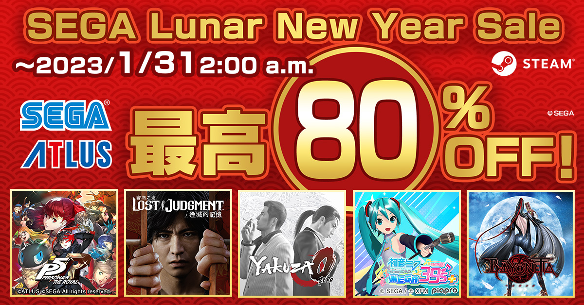 世雅股份有限公司宣佈,目前正在Steam平台舉辦限時促銷活動「SEGA春節特賣」,於Steam販售的部分SEGA・ATLUS的PC遊戲作品將以優惠價格販售。