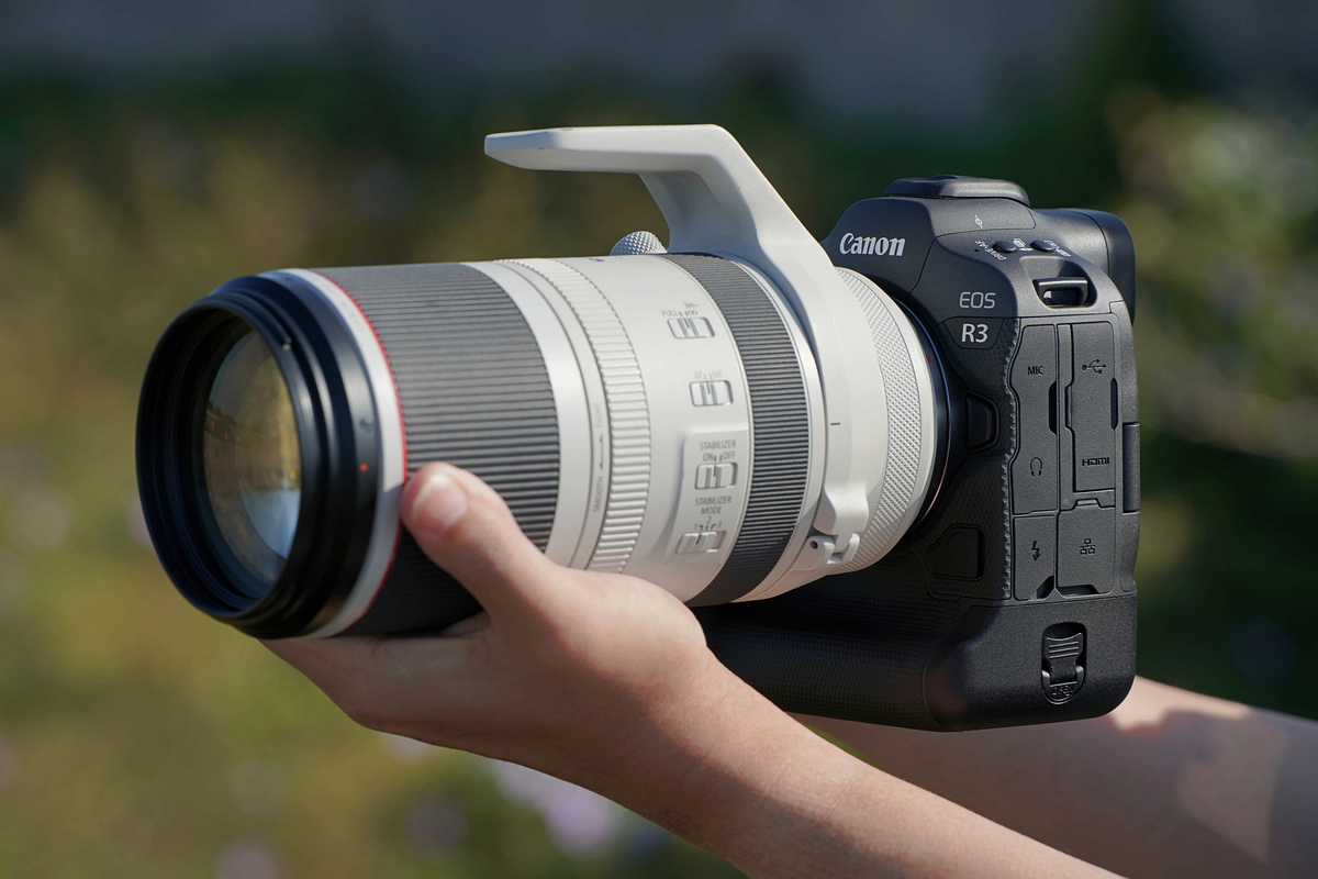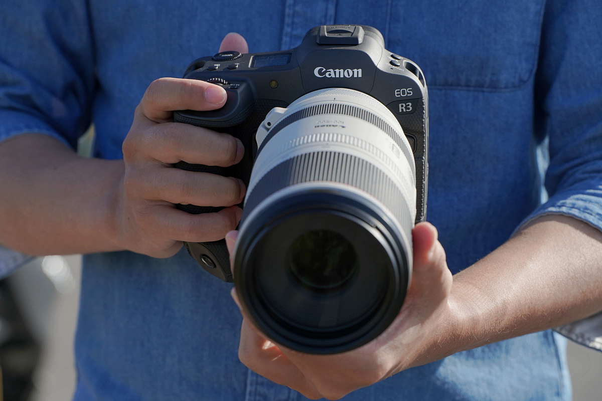 EOS R3 除了內建垂直把手,並配備翻轉式觸控液晶螢幕。3.2 吋約 415 萬點的高解析液晶面板,畫面精細高品質,方便多角度拍攝。沿襲 EOS 傳統的人體工學設計,EOS R3 採用握持性好的凹坑圖案皮飾,設計充滿個性及新鮮感。主選單、播放、刪除等按鈕,電源開關、靜態影像拍攝/影片拍攝開關等操作按鈕,佈局與 EOS-1D X 系列大致相同,使用者可以很快上手。為了方便在暗處的操作,主選單及播放相關的按鈕都設計了背光照明。EOS R3 採用與 EOS-1D X 系列通用的大容量電池 LP-E19,而且還支援 AC 電源供應器,亦可支援透過 USB Type-C 端子實現 USB 供電或充電,在長時間拍攝影片情況下也不用擔心電池續航問題。