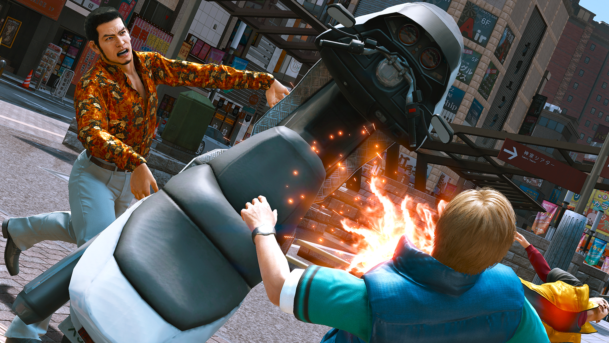▼抬起大型機車揮甩的強力攻擊,是海藤獨有的招式!