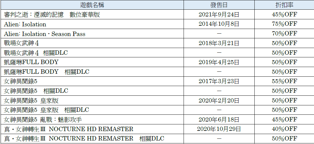本次促銷活動中,相關DLC也將以優惠價販售。ATLUS開發的『女神異聞錄5』、『女神異聞錄5 皇家版』等遊戲的眾多DLC將提供50%OFF的折扣優惠。敬請把握機會,一次買齊遊戲本體與DLC,盡情享受您喜愛的人氣作品。