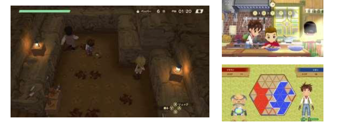 除了牧場以外,還有許多可遊玩的地方!挖掘遺跡、料理打工、佔地盤遊戲等……