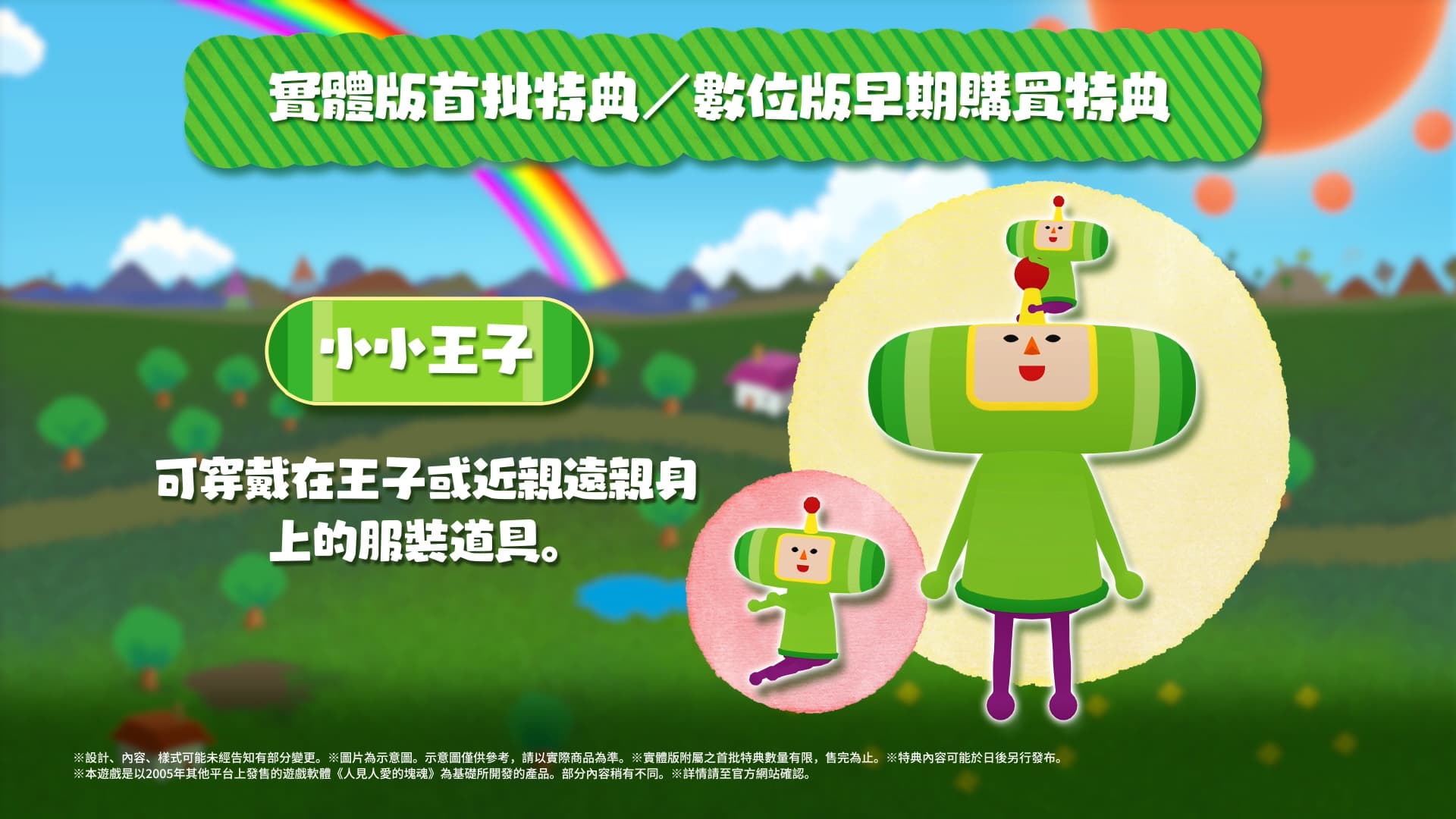 購買DLC「塊魂系列樂曲包」的玩家更可獲得特典「服裝道具:小小大王」,將可愛的小小大王穿戴在王子或近親遠親的身上。