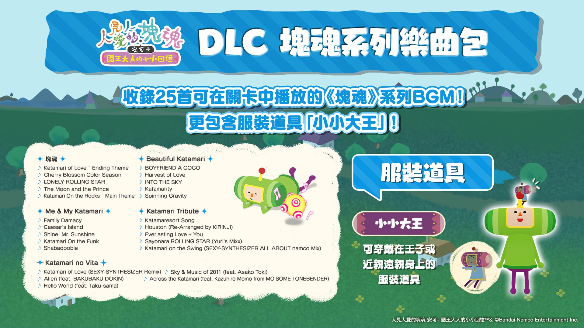 .遊戲本篇 .DLC 塊魂系列樂曲包: -塊魂系列BGM25首 -服裝道具:小小大王