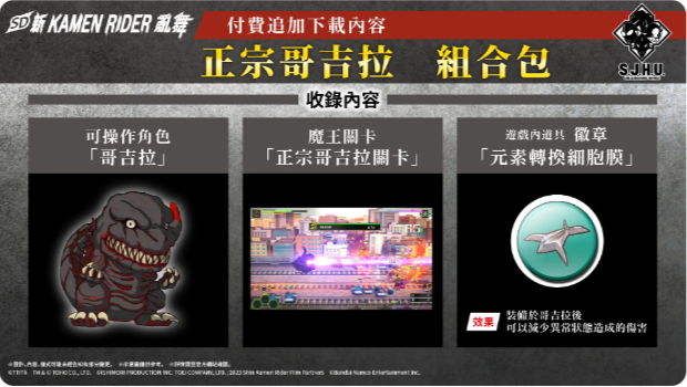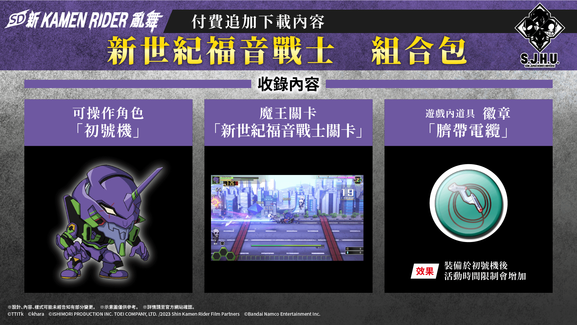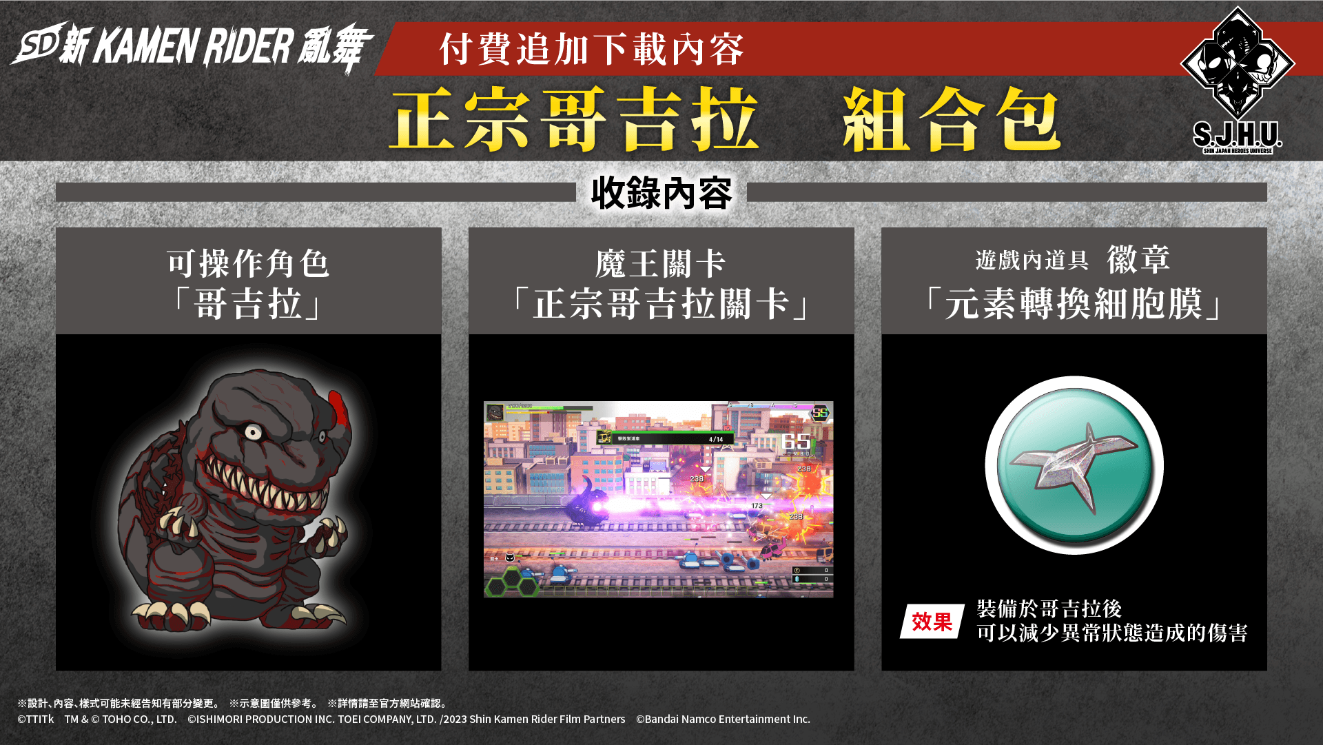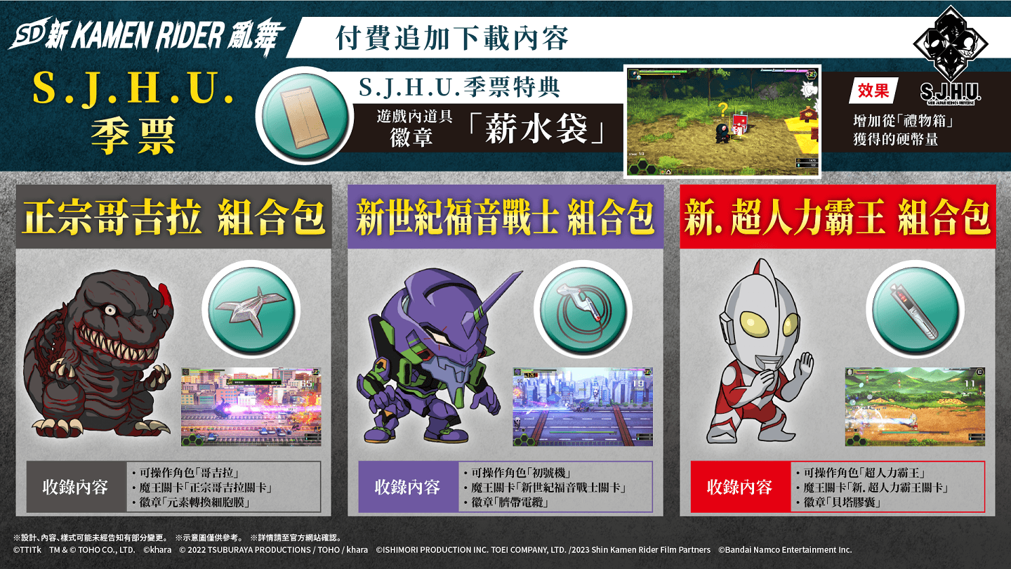 包含可操作角色「初號機」、「超人力霸王」及「哥吉拉」的付費追加DLC「S.J.H.U.季票」已於今日正式發售。 單獨收錄各可操作角色的DLC組合包亦將於日後陸續發布,敬請期待。