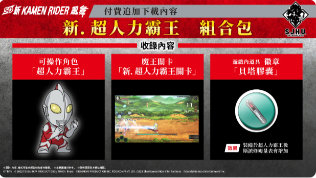 版權標示:©TTITk TM & © TOHO CO., LTD. ©khara © 2022 TSUBURAYA PRODUCTIONS / TOHO / khara ©ISHIMORI PRODUCTION INC. TOEI COMPANY, LTD. /2023Shin Kamen Rider Film Partners ©Bandai Namco Entertainment Inc.