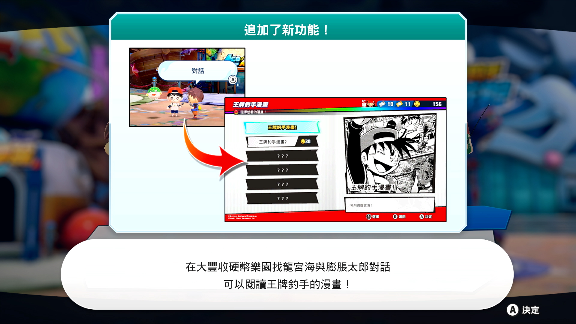 在本次更新中,玩家將可使用硬幣閱讀《王牌釣手》漫畫,體驗以漫畫雜誌《COROCORO》中所連載的漫畫版《王牌釣手》為基礎設計的限定任務。不管是漫畫讀者或是全新粉絲都能盡情享受本次更新的內容。