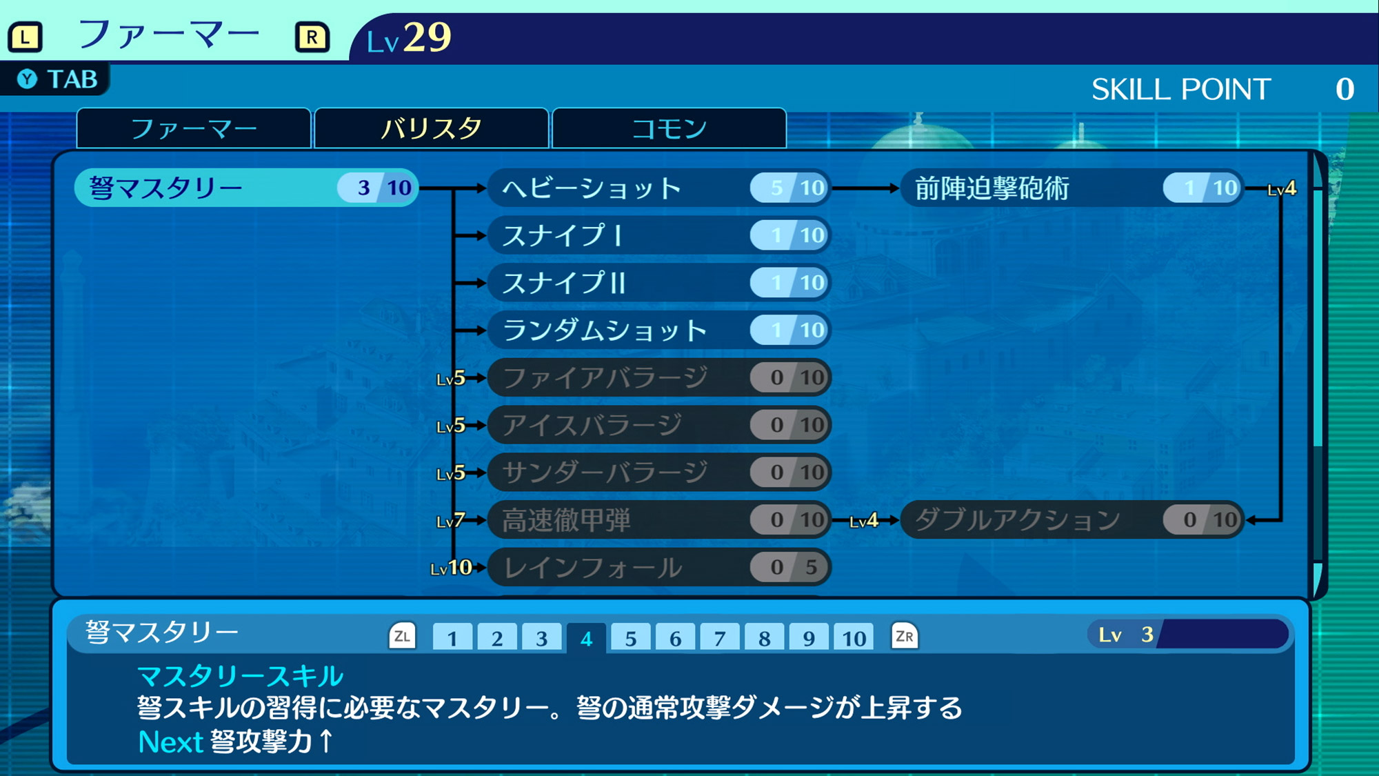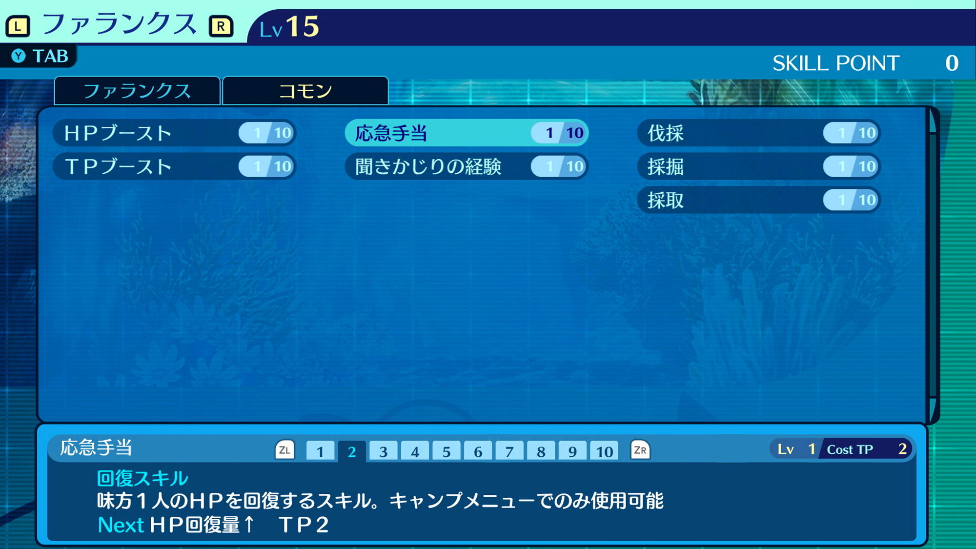 所有職業皆可學習的全7種技能。提升最大HP或TP、即便未被編入探索成員裡也能獲得經驗值等多數戰鬥以外也能發揮效果的技能。