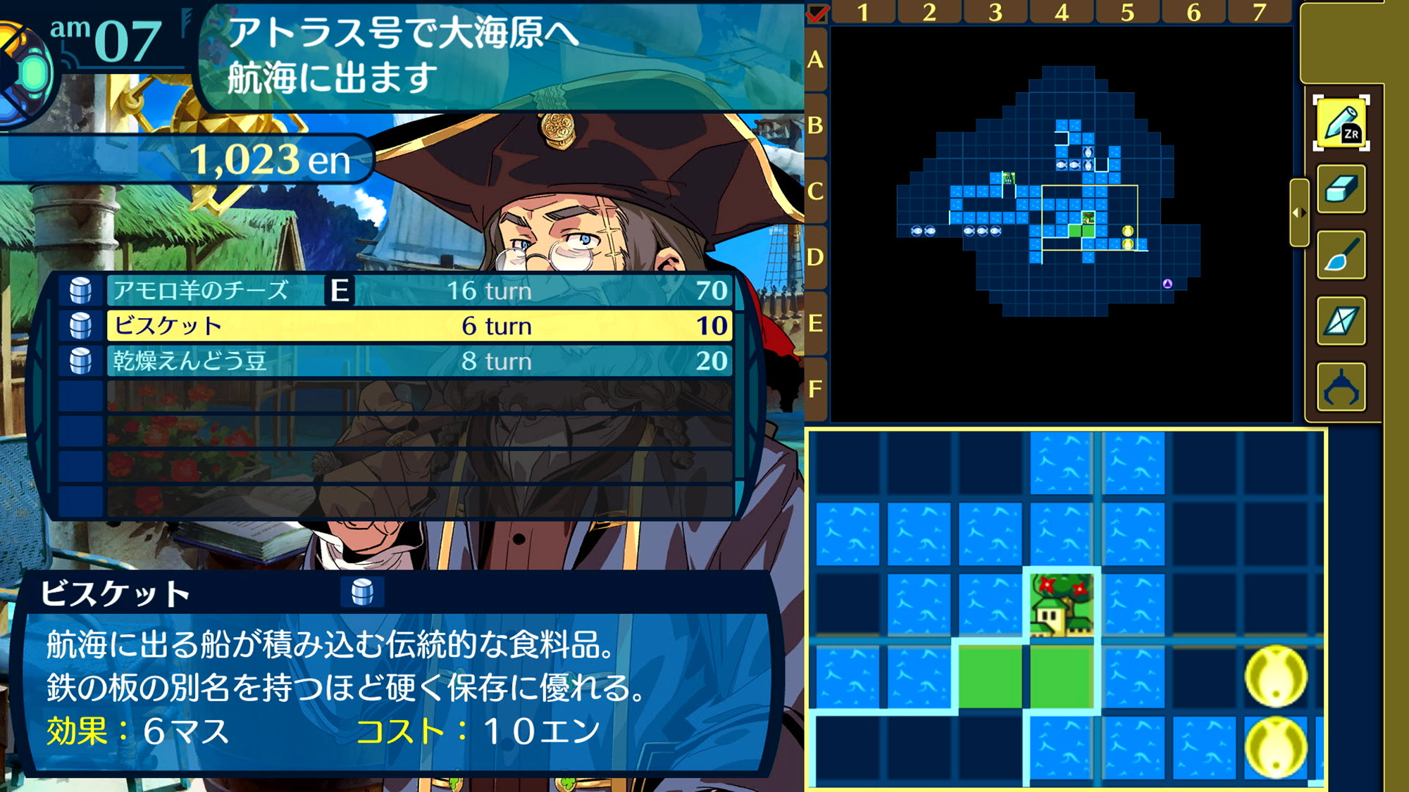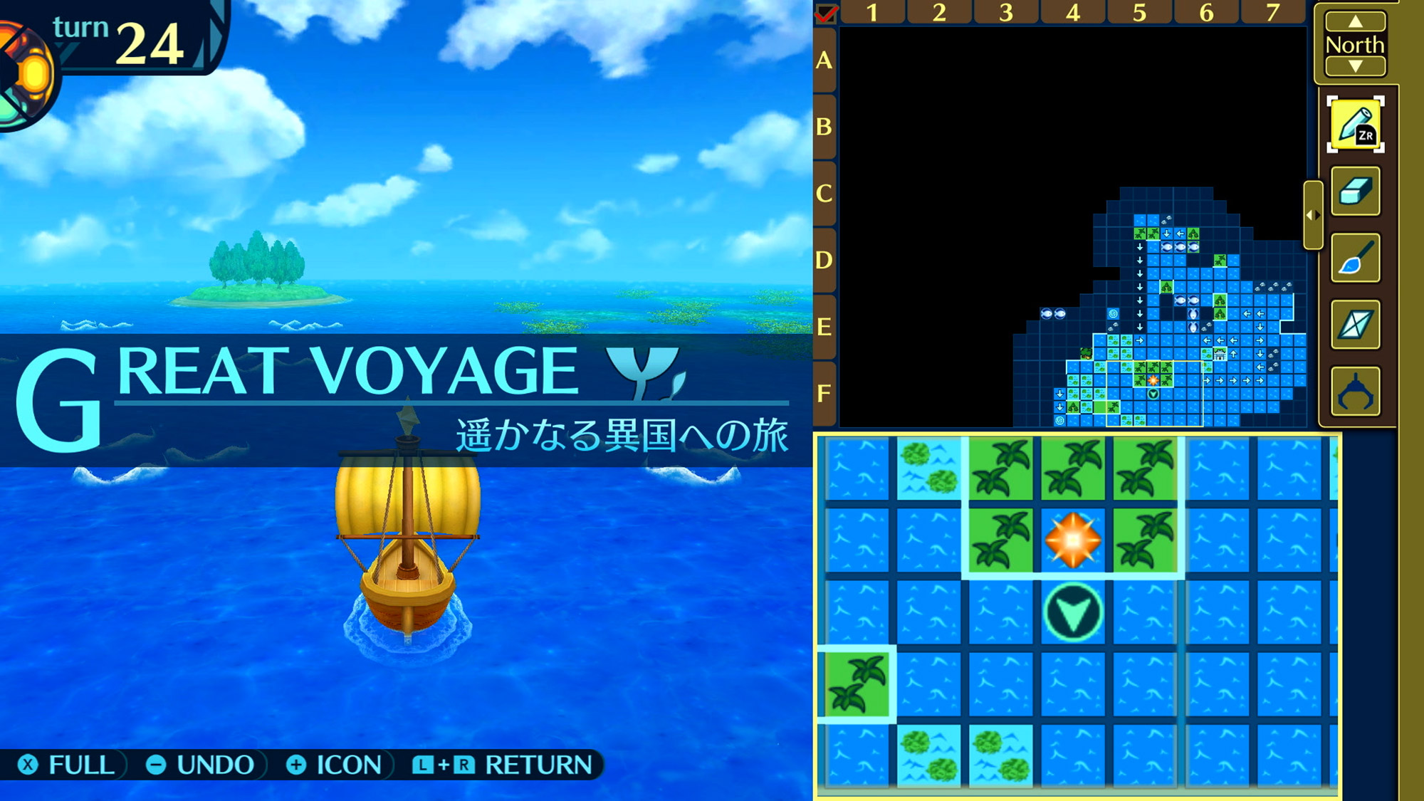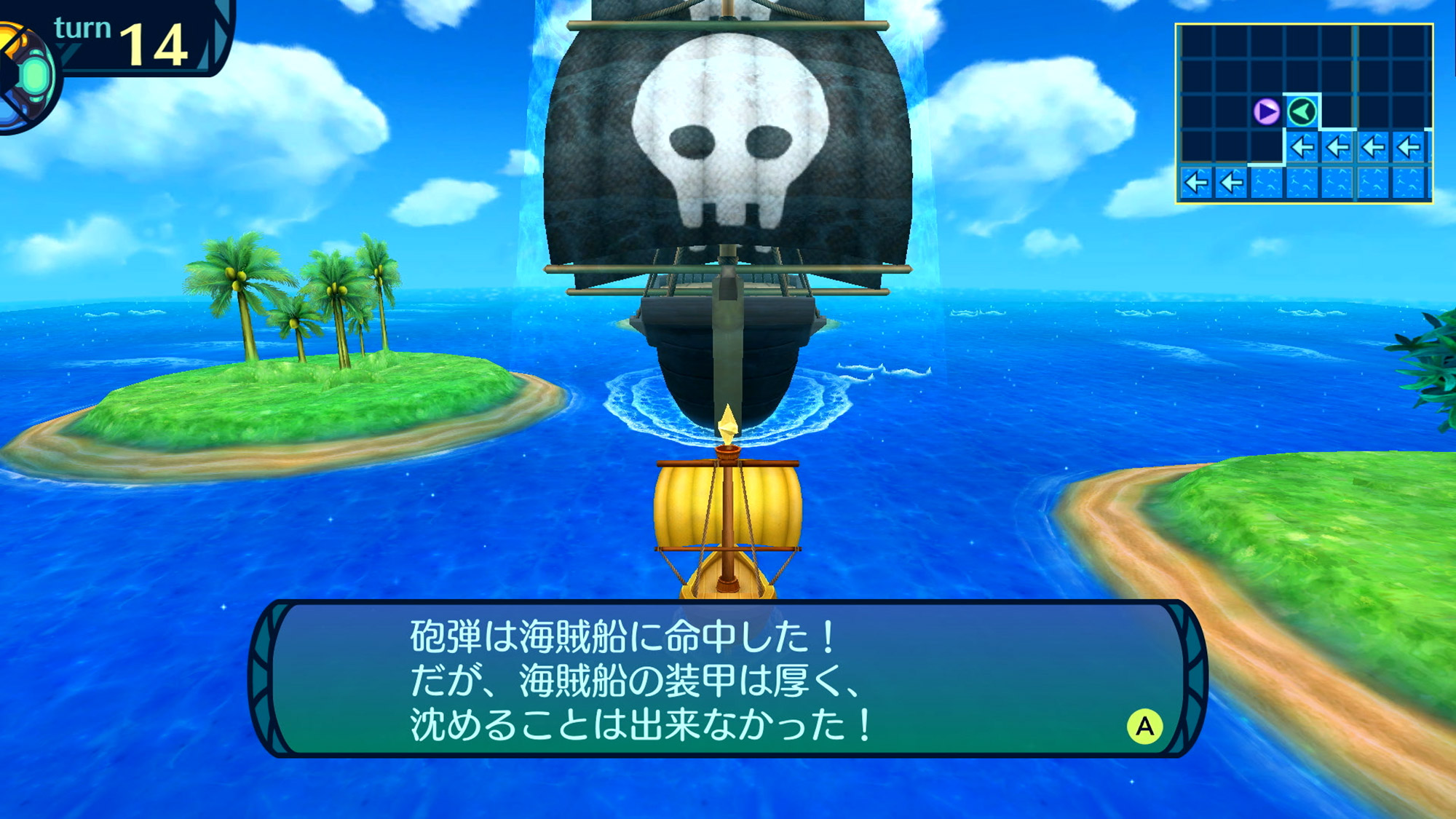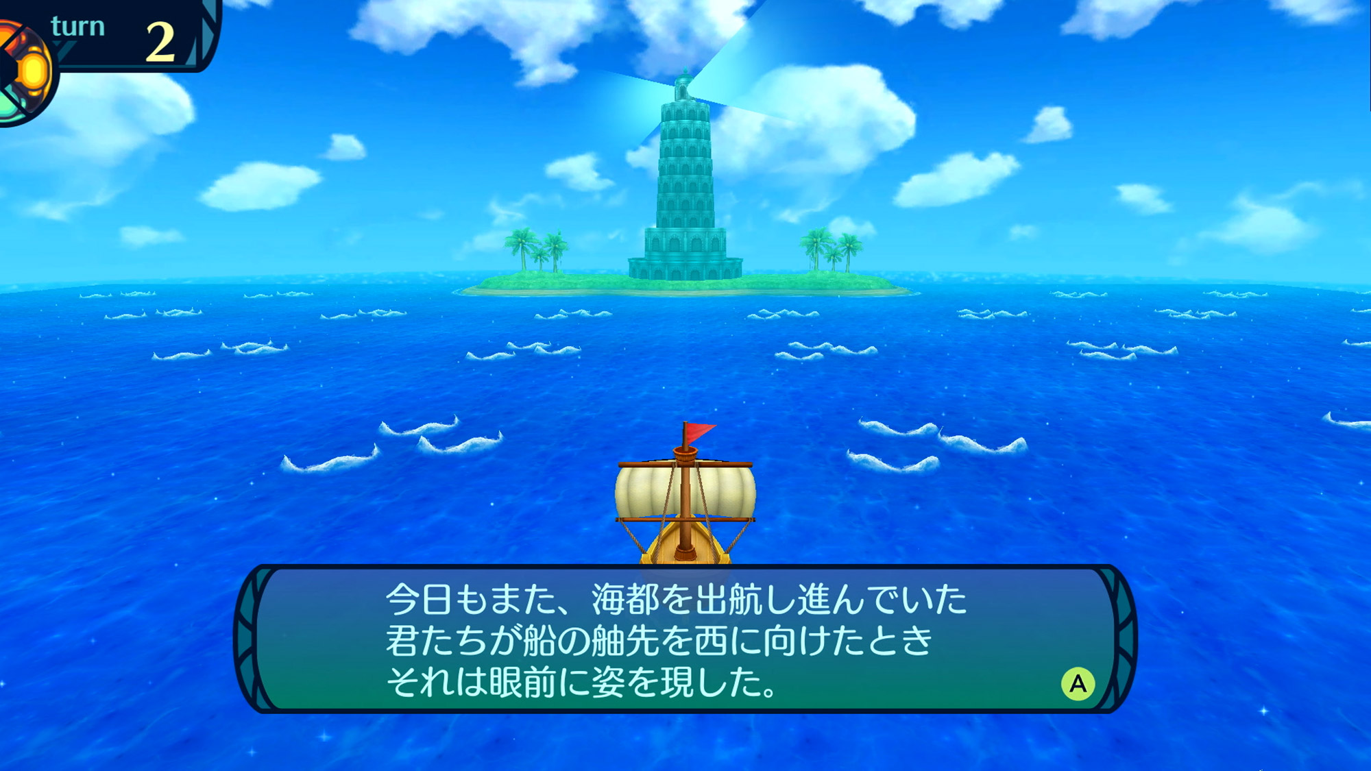 ↑海上有流往特定方向的潮流或是會破壞船隻的漩渦等不同於迷宮的機關。船隻的移動天數(航海天 數)會因儲備的食材或裝備而有所變化,因此善用船隻的裝備與海上的機關來前進也是攻略的重點。