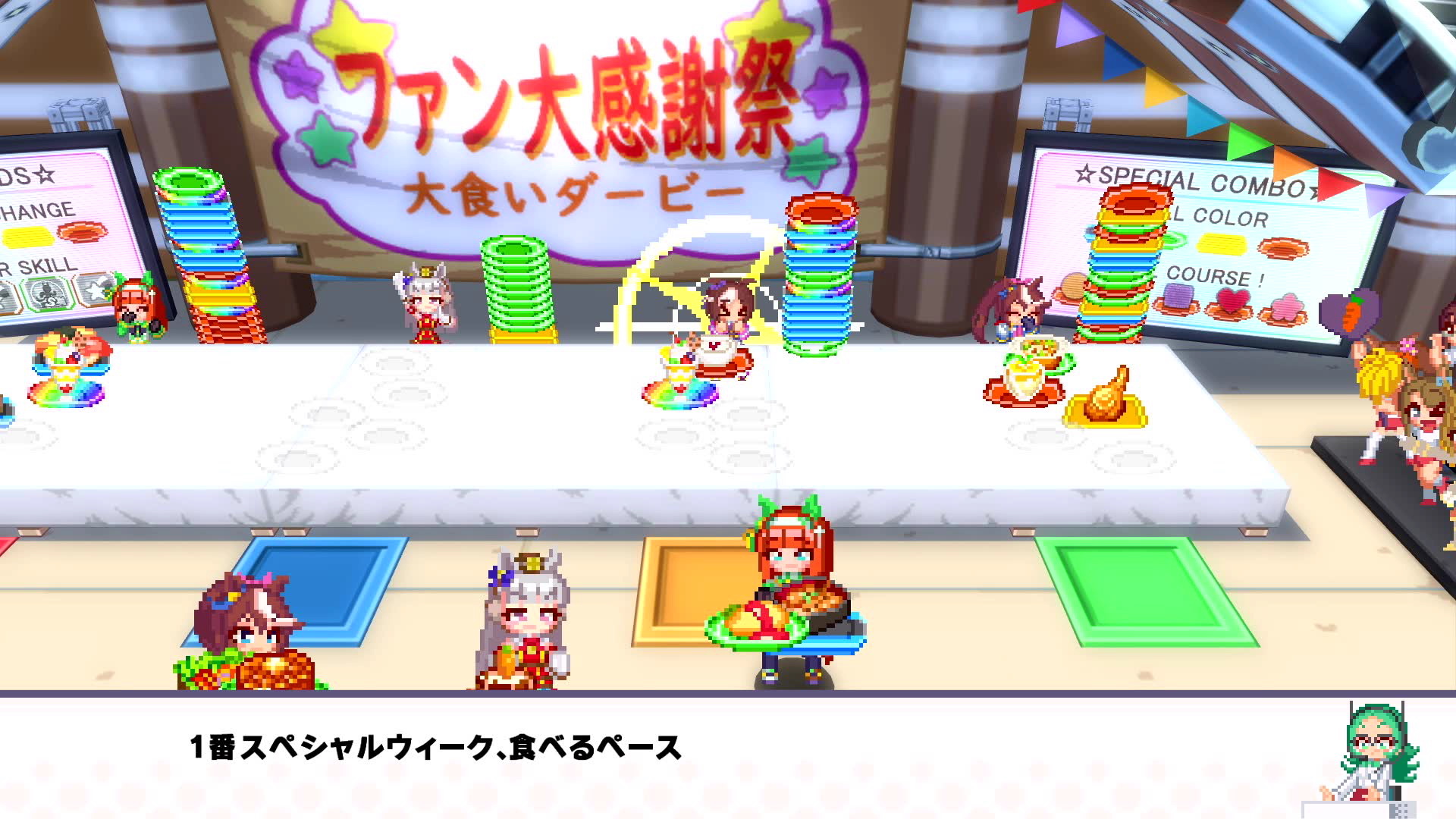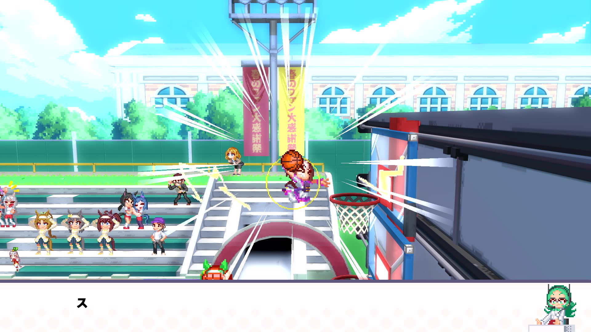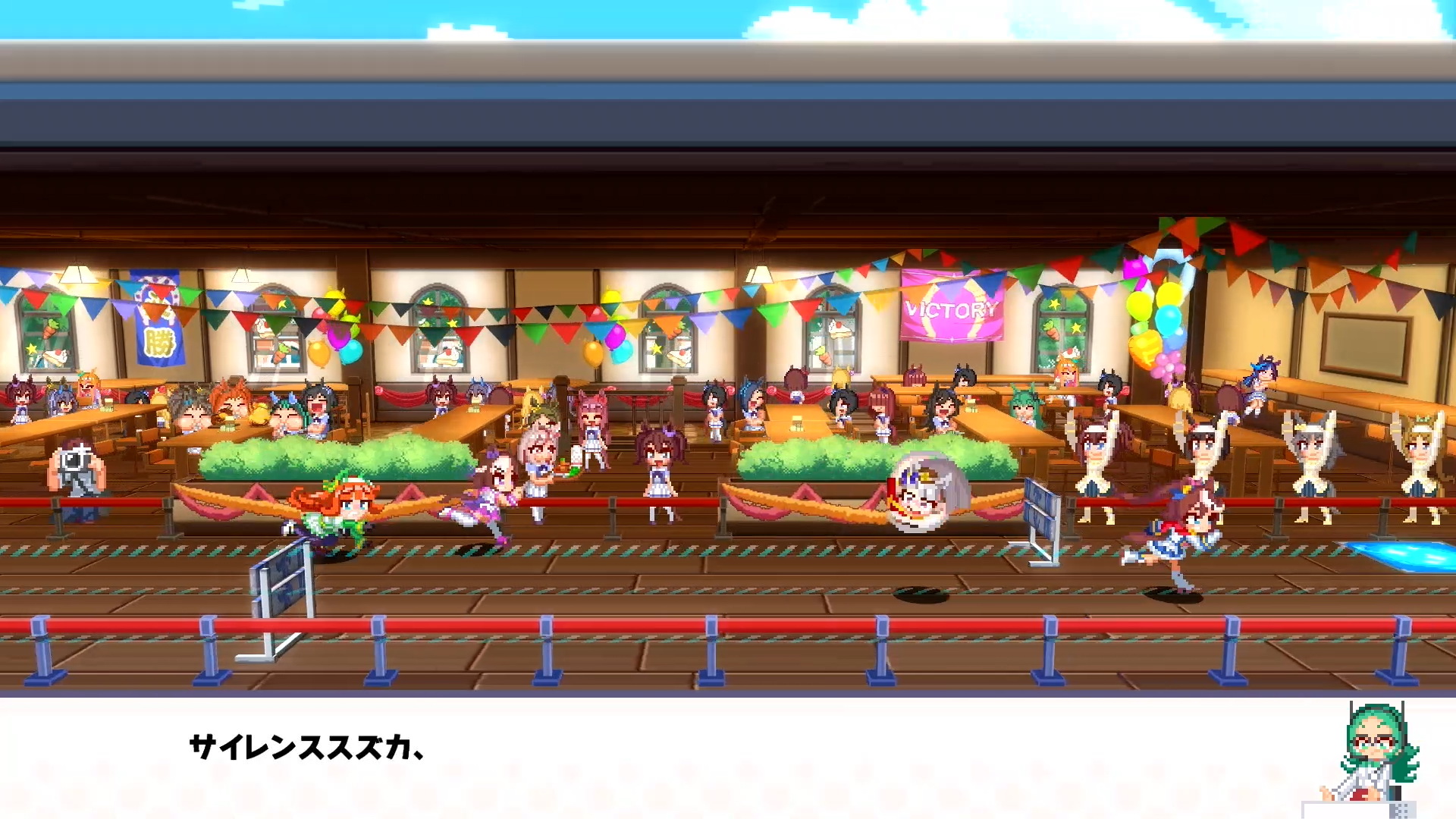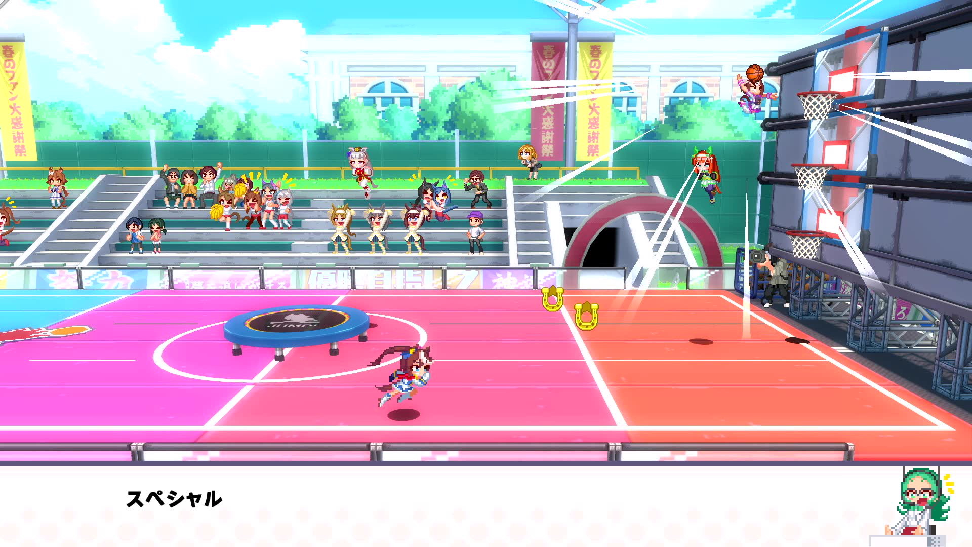 由特雷森學園主辦的粉絲大感謝祭之特別活動,選手們採團體戰進行「大障礙賽」、「籃球」、「躲避球」、「大胃王」四種喧鬧項目。各項目將由代表賽馬娘分別出場,以拿下勝利為目標。操控點陣風格的熟悉角色奮鬥到最後一刻吧。