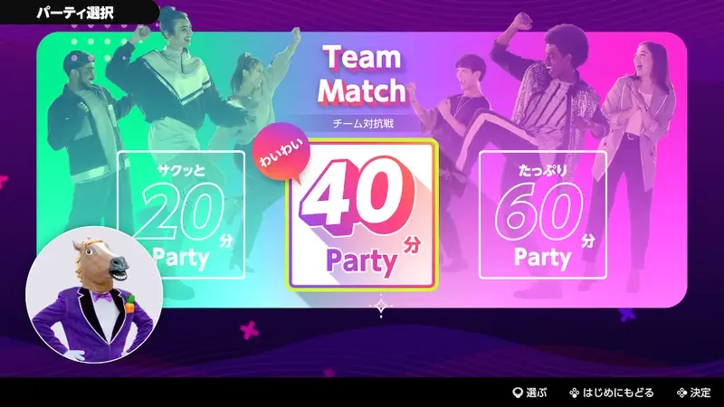 在「Team Match」中,在選擇以Joy-Con模式或智慧型手機模式進行比賽後,參加者將分為兩個隊伍。在各種遊戲中獲勝並首先達到目標積分的隊伍就能勝出。
