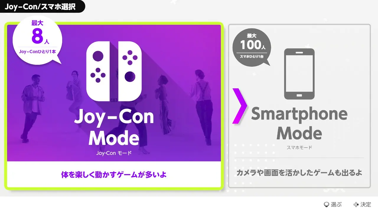 《Everybody 1-2-Switch!》在Joy-Con模式下最多支援8人,在智慧型手機模式下最多支援100人一起遊玩。