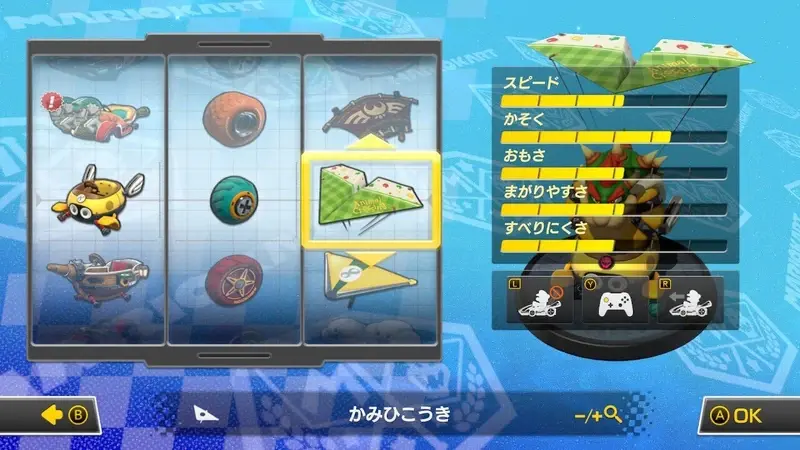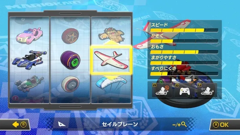 滑翔翼這個零件主要會影響到賽車的重量和加速。對比賽影響的程度小於其他2種零件,因此不知該如何選擇時,建議就配合其他2種零件,挑選可讓整體性能變得更加平衡的滑翔翼。