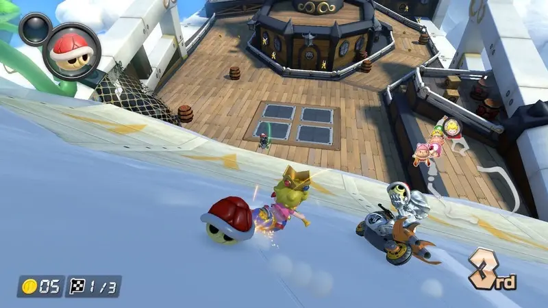 將道具吊掛在車輛後方時,可以防禦對玩家緊追不捨的「紅龜殼」等,從後方飛過來的道具。