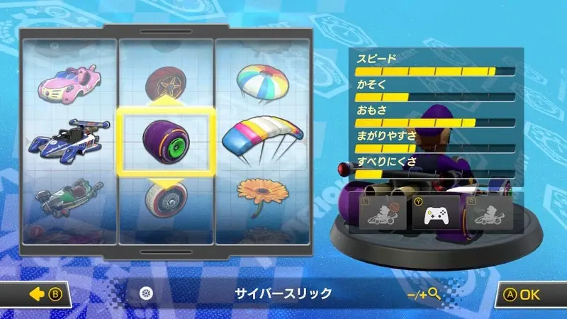 輪胎會強烈影響到速度和過彎性。有速度較快的輪胎、不容易被對手彈飛的輪胎,以及可以輕鬆過彎的輪胎等,具備各式各樣的特色。根據特性來選擇適合自己的輪胎吧。