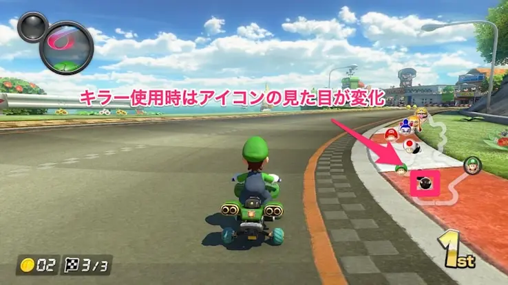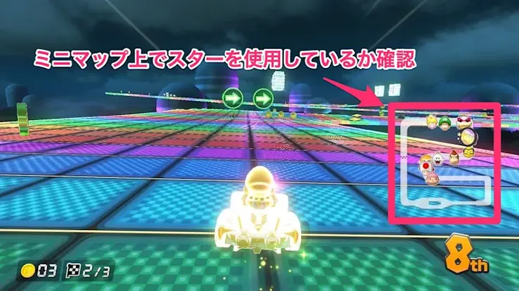 此外,觀看螢幕右方的迷你地圖,可確認部分道具的使用狀況。例如,正在使用「無敵星」的角色圖示就會發出七彩光芒。只要利用這一點,先確認過無敵狀態的角色不多後再使用「閃電」,就可攻擊到更多的對手。其他像是使用「炮彈刺客」(角色圖示會變成炮彈殺手的符號)、「害羞幽靈」(使用的玩家角色圖示會消失)等道具時,迷你地圖中的圖示也會出現變化,因此比賽時要時常確認。