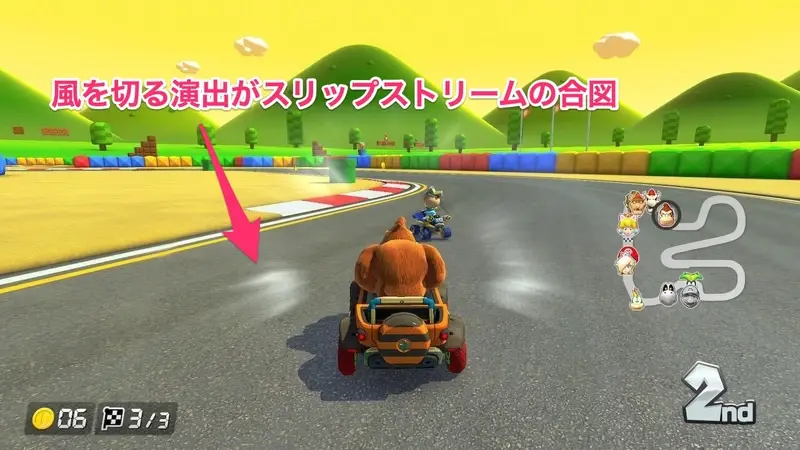 由於小路和彎道內側的行駛路線受到侷限,比較容易跟在對手後方,因此可以積極地在這些地方嘗試發動滑流。