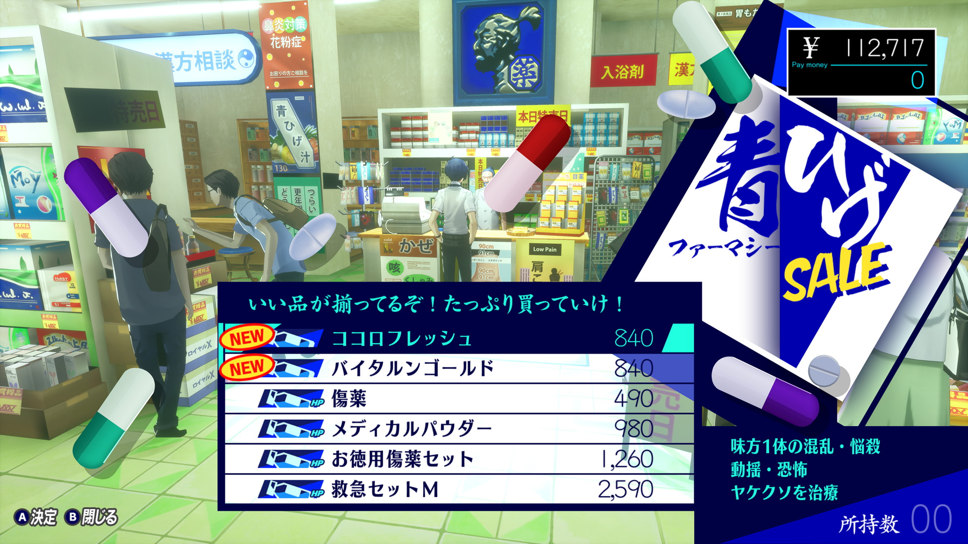 在波羅尼亞購物中心的藥局。能在此購買可在塔耳塔羅斯內使用的恢復道具,是探索塔耳塔羅斯前進 行準備時不可或缺的設施。