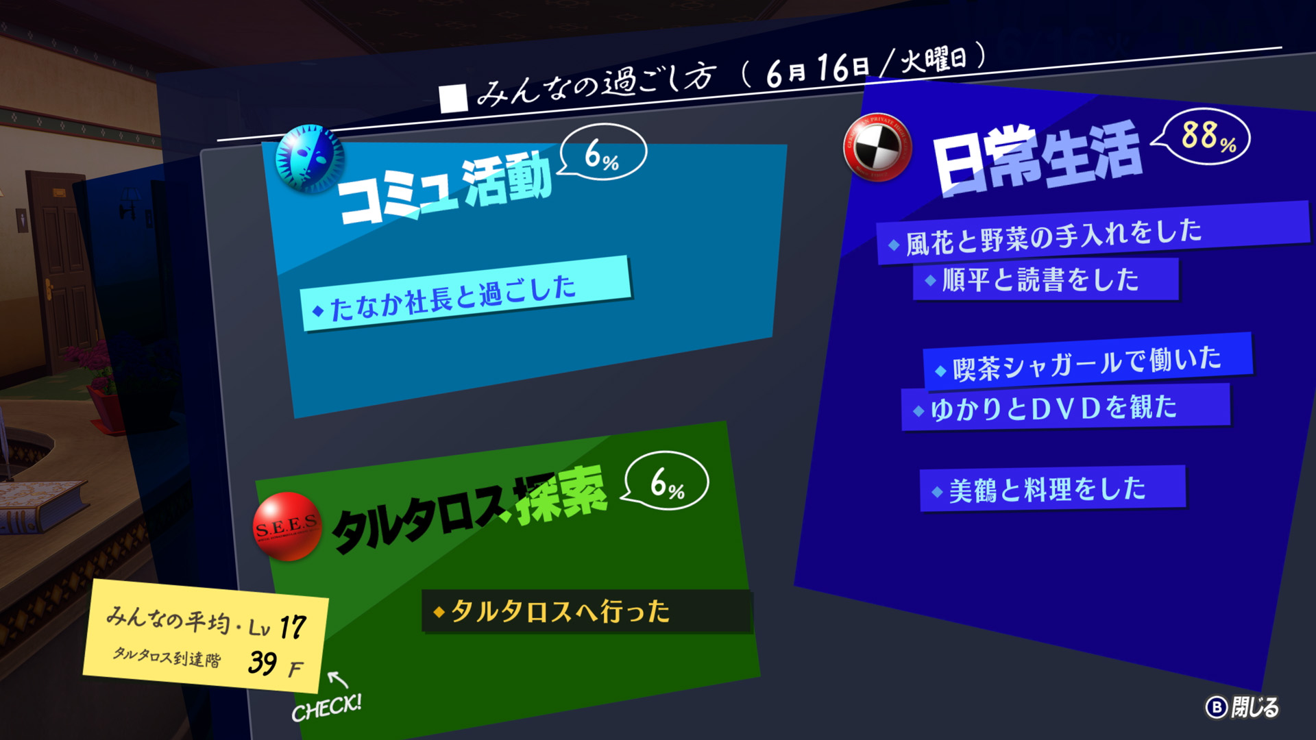 開啟網路功能後,可確認其他玩家在放學後、夜間自由行動、授課中等時段的行動中進行了什麼選擇。 對於自由行動時間內該做什麼才好而拿不定主意時,可以活用此功能來獲取行動的提示。