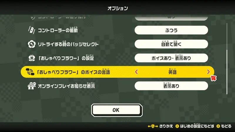 原本遊戲內的文字和聲音語言會根據Nintendo Switch主機設定自動設定,但在本作中,可維持遊戲中現有的文本,將閒聊花花的語音切換為下列語言。