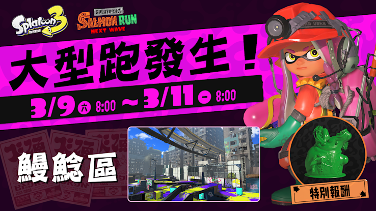 在鮭魚跑裡,除了新場地「鮭魚心臟鬥技場」會登場之外,大量鮭魚逼近占地對戰場地的「大型跑」,目前預測將會於3月9日(六)早上8:00~11日(一)早上8:00在「鰻鯰區」發生。
