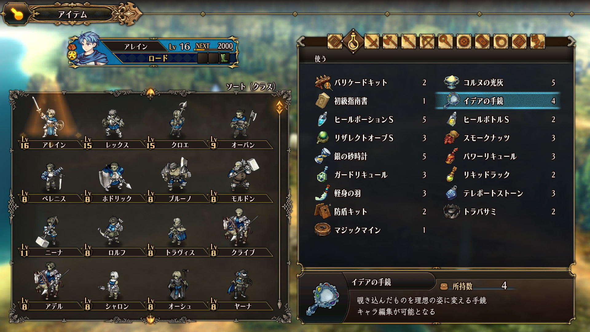 ・可變更的角色配色 只要使用特殊道具「伊黛雅的手鏡」,即可調整角色的配色。從雇用角色到亞連、史嘉蕾等固有角色, 都能以此道具調整為自己喜歡的顏色。另外,同時也可進行成長類型的變更。