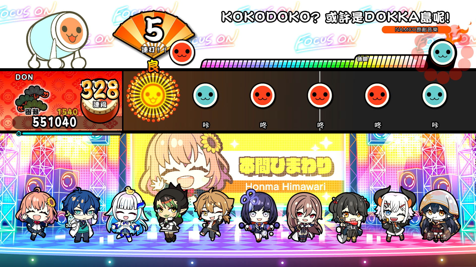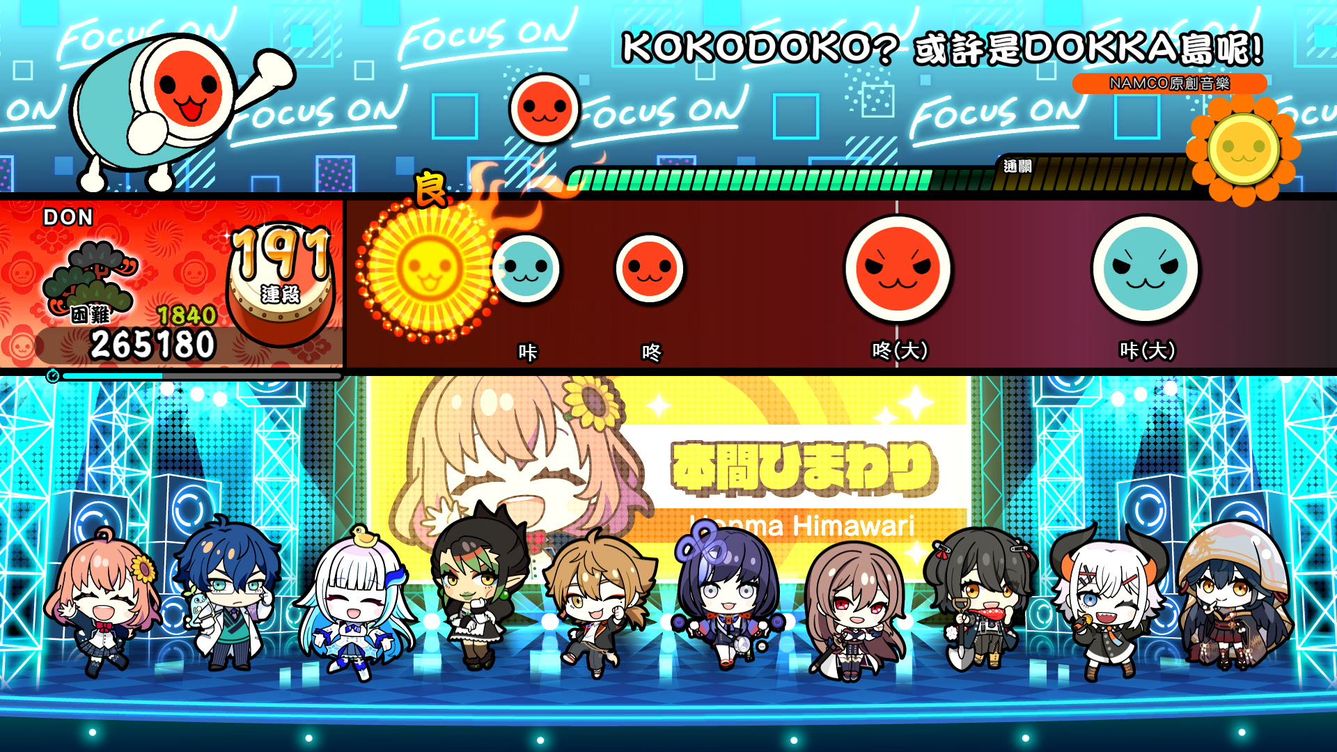VTuber團體「NIJISANJI」中的音樂團體「FOCUS ON - NIJISANJI SINGLE COLLECTION –」,由其中10名成員所演唱的合作原創樂曲〈KOKODOKO? 或許是DOKKA島呢!〉是一首既熱鬧又歡快的樂曲,透過《太鼓之達人》音效團隊的精華使個性截然不同的成員們的魅力嶄露無遺。