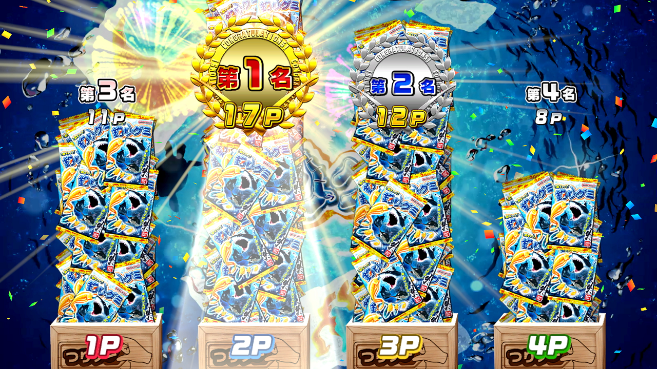 最後階段時,努力釣起畫面中滿滿的軟糖大魚們,以奪得第一為目標。
