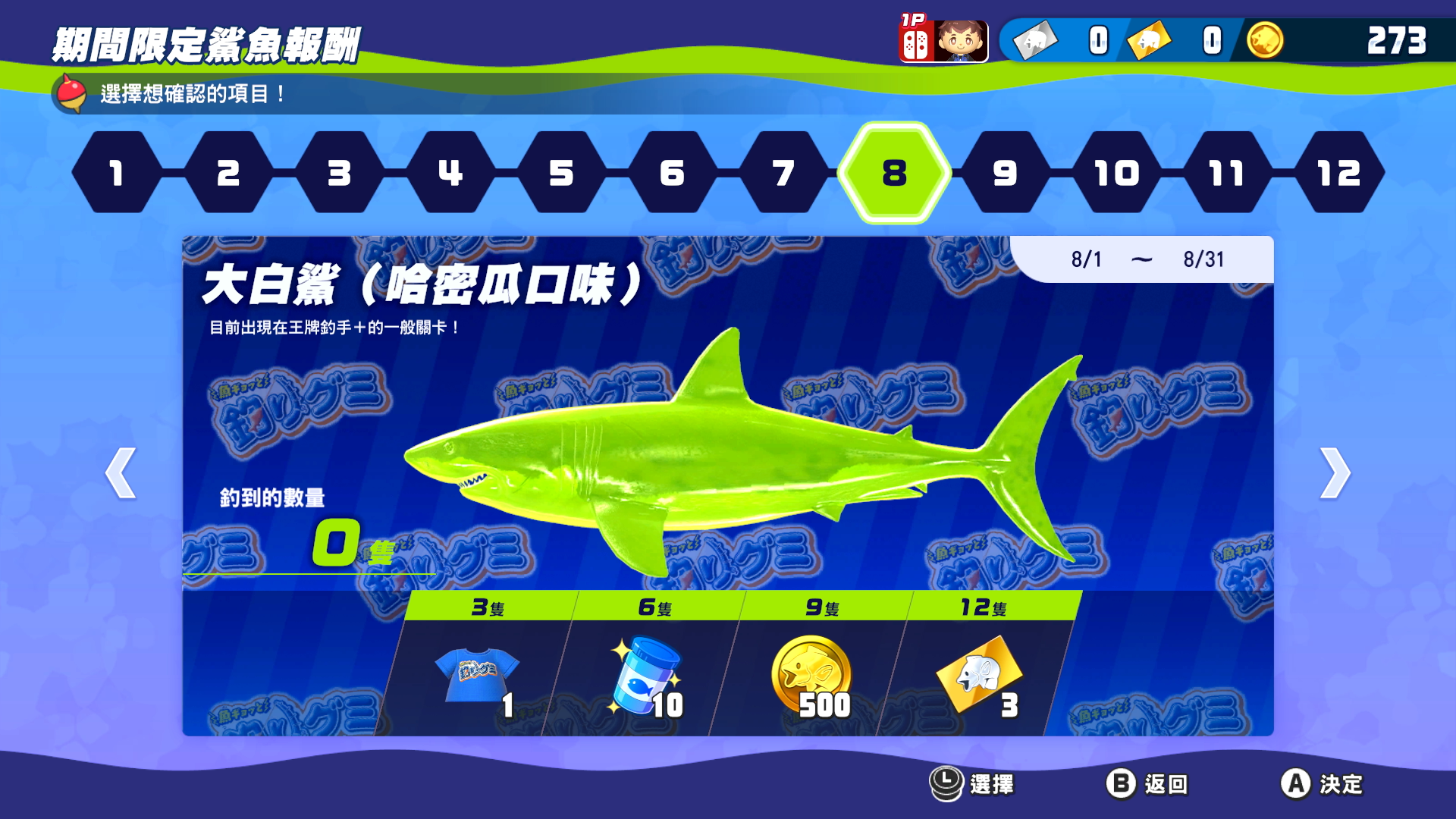 在可以釣到當月限定鯊魚的「鯊魚祭典」中,即將在8月登場的是「大白鯊(哈密瓜口味)」,9月登場的則是「鯨鯊(哈密瓜口味)」。