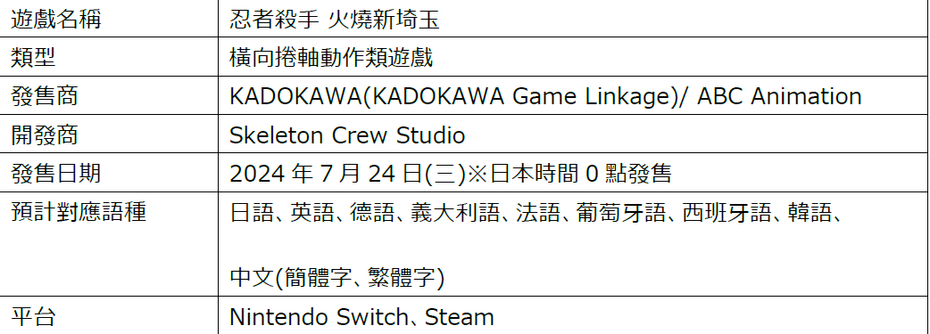 KADOKAWA Game Linkage Inc.(總公司:東京都文京區、執行董事總經理:豊島秀介)宣布,為紀念小說《忍者殺手》在Twitter(現稱X)上開始連載的紀念日,《忍者殺手:火燒新埼玉》的Nintendo Switch版以及Steam版將於日本時間7月24日(三)0點發售(僅提供下載版)。