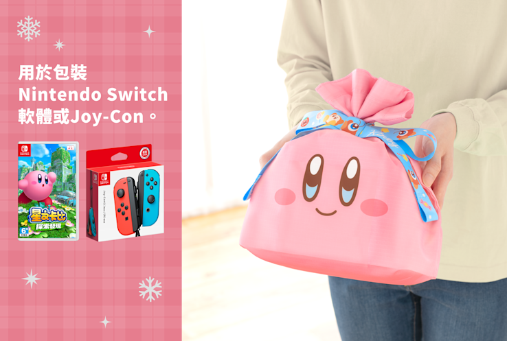 「星之卡比」的禮品 x 購物袋現已登場。L是較大的尺寸,除了Nintendo Switch系列主機外,還能裝下Nintendo Switch軟體及Joy-Con。只要綁上隨付的緞帶,再把收納包放上去就完成了。打開包裝後,可以把袋子當作購物袋來使用。