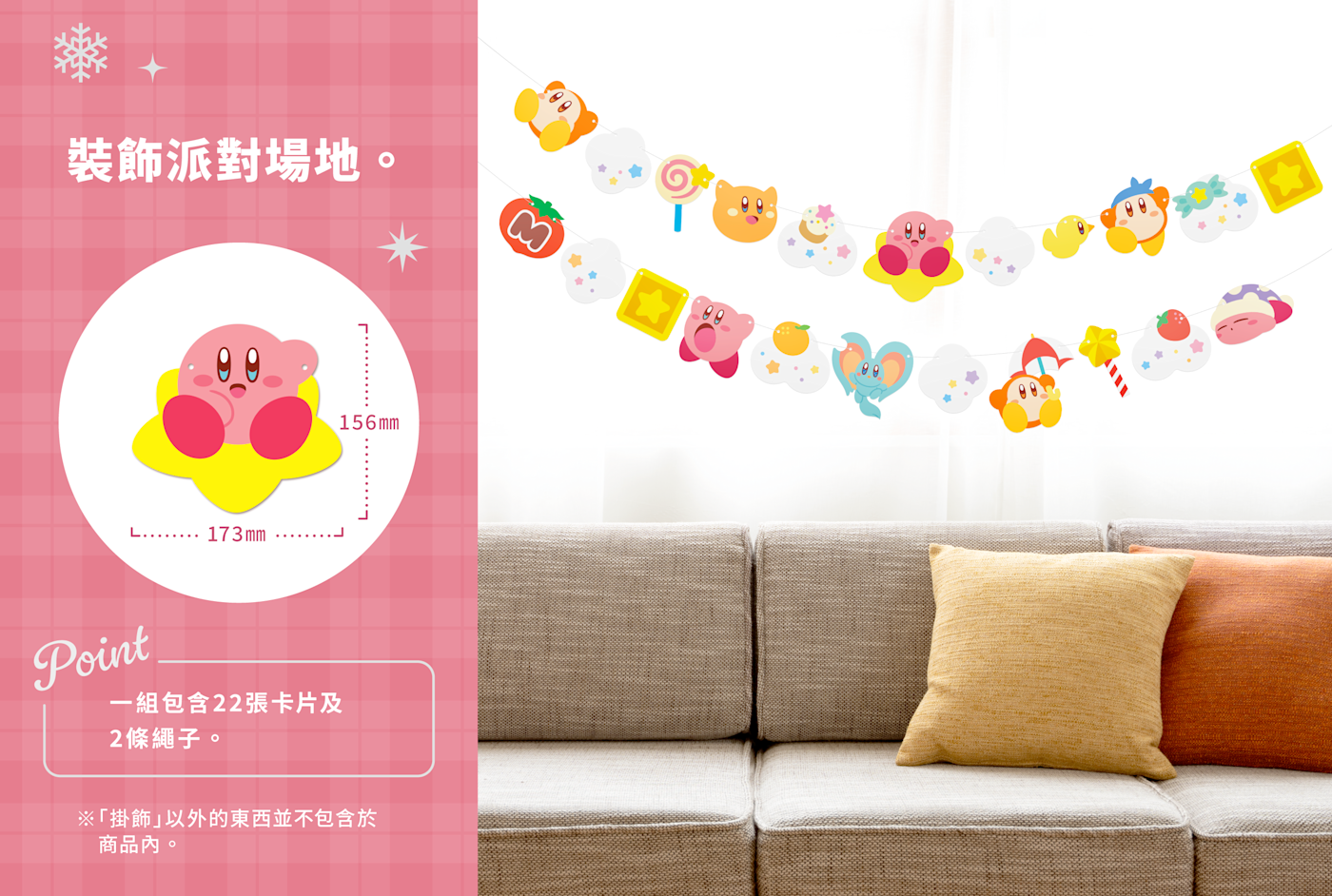 一組掛旗包含22張卡片及可以把卡片串連起來的繩子。掛旗以卡比及角色們在空中散步的模樣為設計理念。除了可以布置自己的房間,還能用來裝飾生日派對等場景。