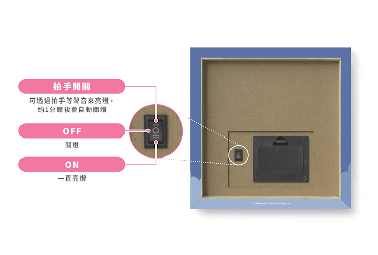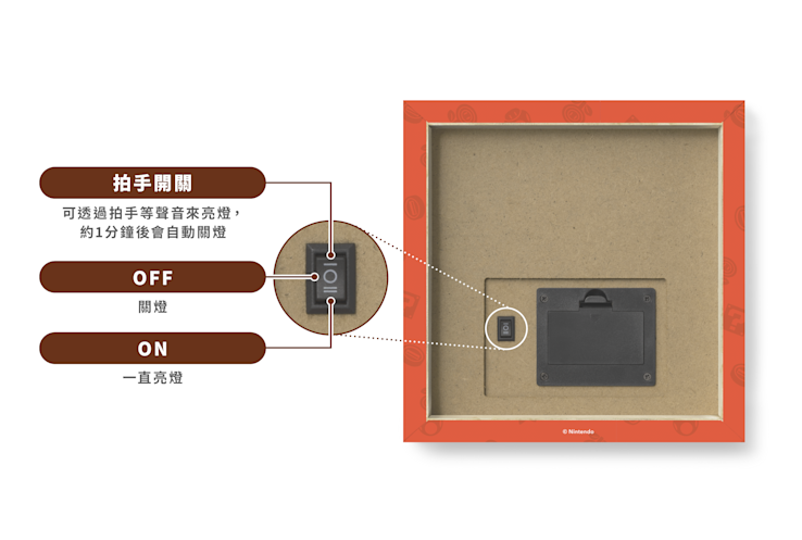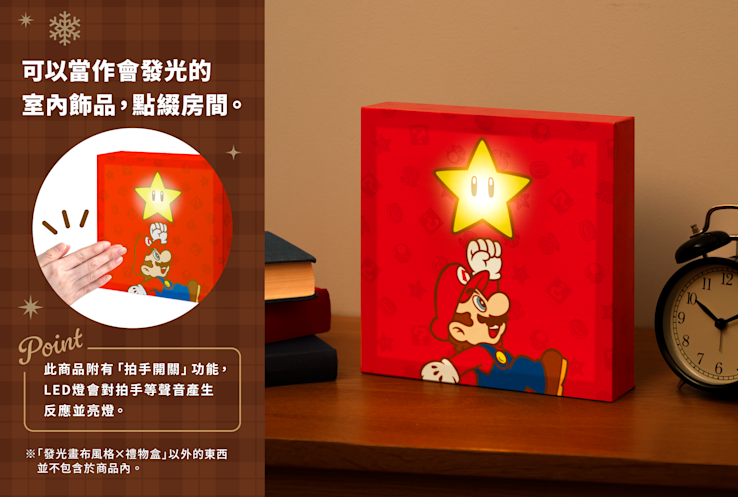 可以當作禮物盒,放入Nintendo Switch的軟體、糖果零食、手帕等禮物,也可以當作發光的室內飾品。只要把電源調至「ON」,LED燈就會亮起,無敵星的部分將會發光。此外,商品亦備有「拍手開關」功能,透過拍手等聲音就能亮燈。除了用來包裝禮物,這件商品還可以有別的觀賞方式,非常有趣。