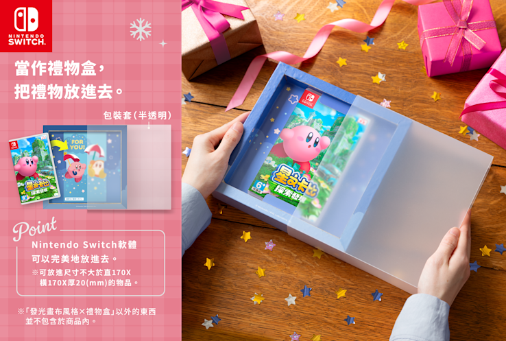 在「星之卡比」的發光畫布風格×禮物盒上,卡比乘坐的傳送之星會亮燈。如果有希望嘗試遊玩卡比遊戲的親朋好友,可以考慮把「星之卡比」的Nintendo Switch軟體放進去,再送給對方。