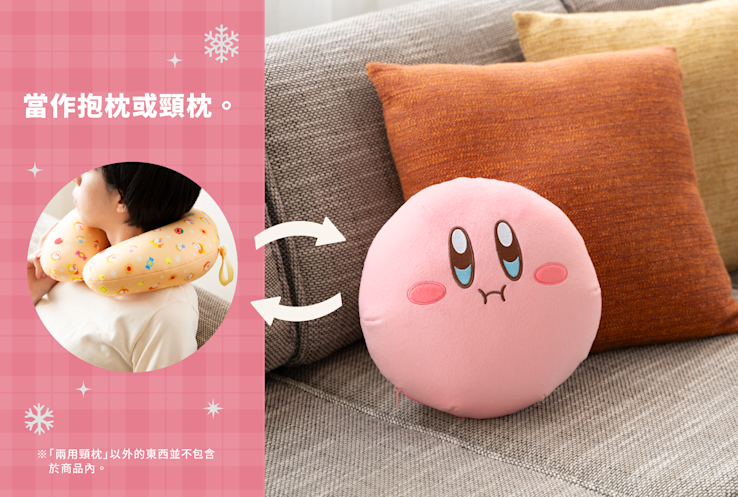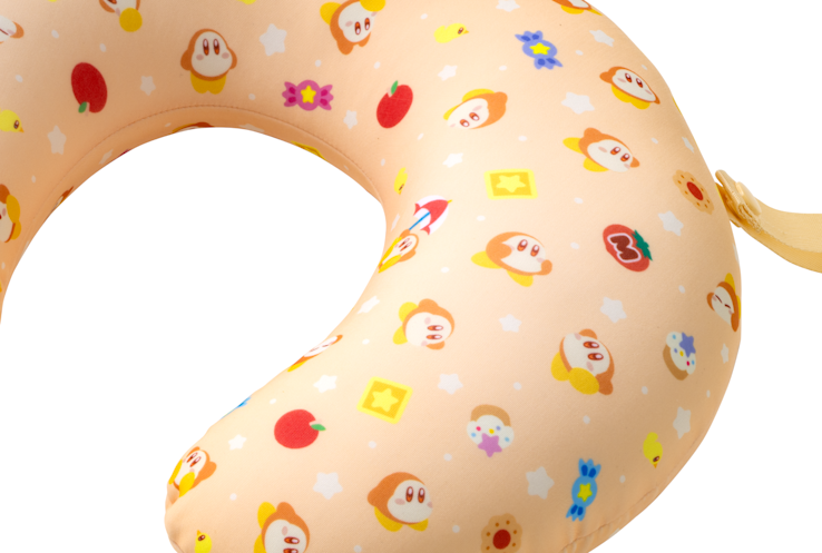 只要把臉頰鼓鼓,塞滿嘴的卡比抱枕內的豆豆移動,就能變成頸枕。仔細看頸枕的圖案,會發現很多瓦豆魯迪跟食物……!搞不好會在裡面發現瓦豆魯篤跟彩虹棒棒糖呢。你也要來尋找看看嗎?