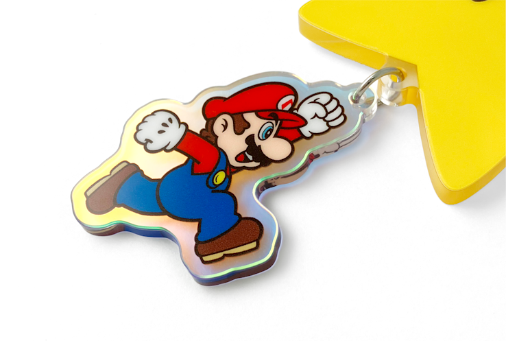 此組合包含壓克力吊飾及貼紙,可以使用貼紙拼湊出訊息,推薦配合「禮品 x 購物袋」一起使用。收到禮物後,可以把吊飾掛在平常帶出門的包包或是背包使用。瑪利歐的部分則是以無敵狀態為造型來設計,並施以幻彩加工。