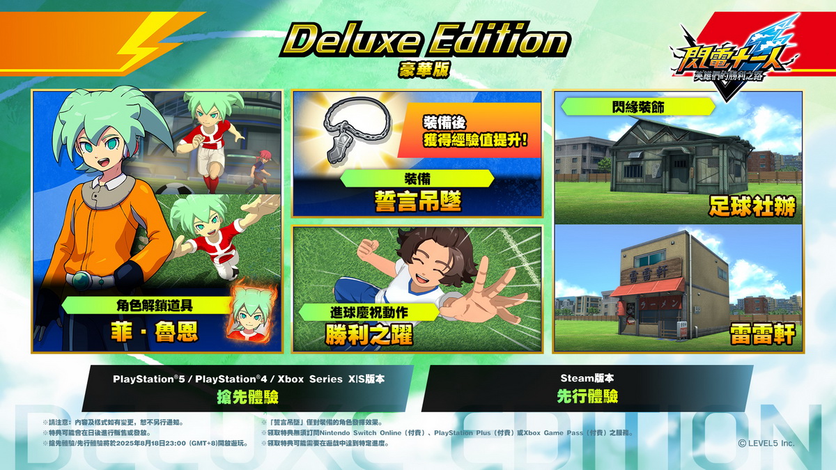 在「豪華版」中,玩家可獲得能於編年史模式與對戰模式中從序盤起就能使用的傳奇角色「菲·魯恩」。除 此之外,還包含可用於裝飾玩家交流區「閃緣小鎮」的限定裝飾、限定進球慶祝動作,以及可提升經驗值