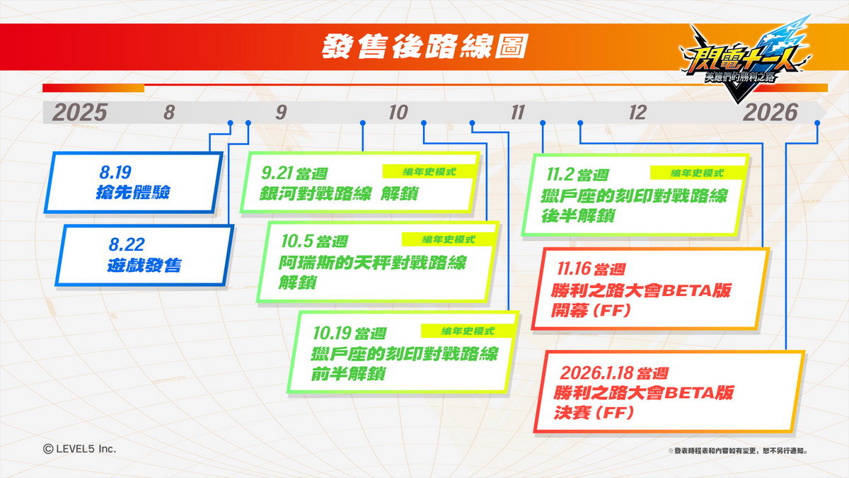 在能重現過去系列對戰的編年史模式中,將陸續開放重現《閃電十一人GO 銀河》之後系列的「銀河對 戰路線」與「阿瑞斯的天秤對戰路線」等內容。此外,預計於11月舉辦線上比賽活動 「勝利之路・Beta」。 這將會是一款發售後也能長期樂在其中的作品。