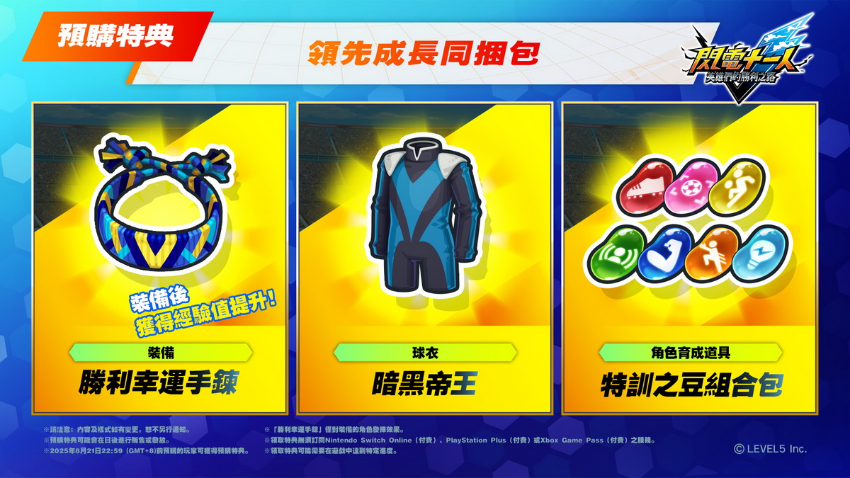 完成預購的玩家,將可獲得「領先成長同捆包」作為特典。內容包含可幫助育成更順利的各種道具,以及裝備後參加比賽即可提升經驗值獲取量的「勝利幸運手鍊」,除此之外,還可獲得在「閃電十一人2」登場的「暗黑帝王」的球衣,千萬別錯過!