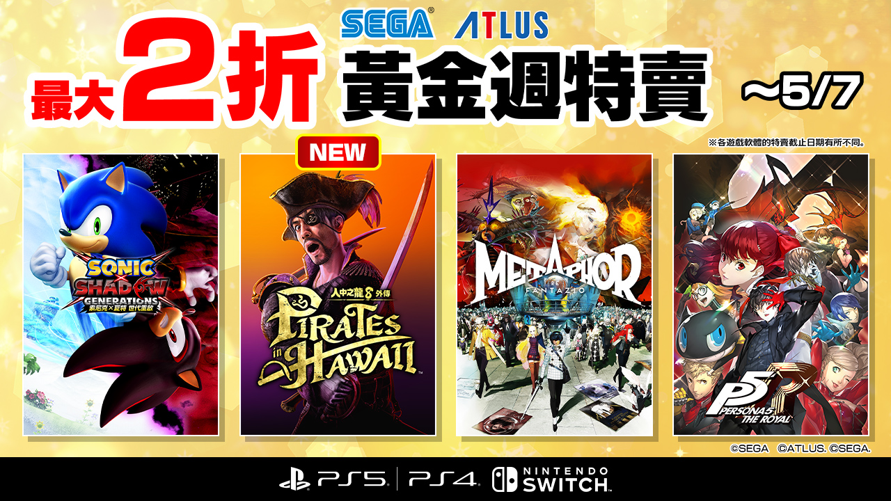 世雅股份有限公司現正舉辦「SEGA黃金週特賣」活動。針對PlayStation™Store及Nintendo eShop所販售的部分PlayStation®5/PlayStation®4/Nintendo Switch™遊戲作品奉上限時特價。