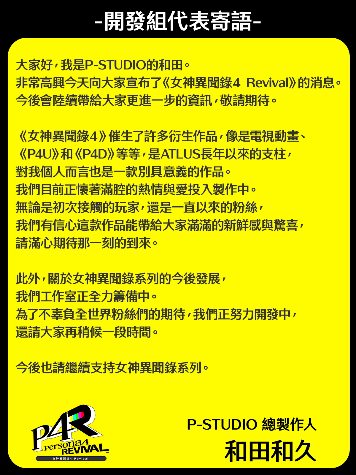 世雅股份有限公司宣布,ATLUS的超人氣RPG《女神異聞錄》系列的新作《女神異聞錄4 Revival》將在Xbox Game Pass、Xbox Series X|S、Windows、PlayStation®5以及Steam平台發售。此外亦同步公開了前導預告片與前導網站,請務必前往觀看。