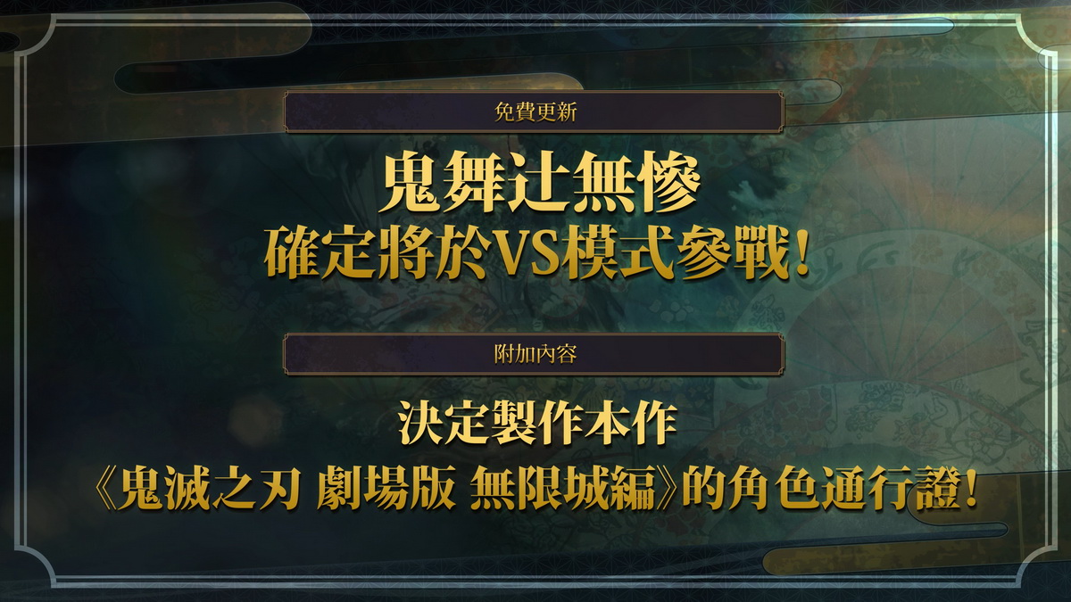 《鬼滅之刃 劇場版 無限城編》中登場的角色將可在VS模式「對戰」中使用。