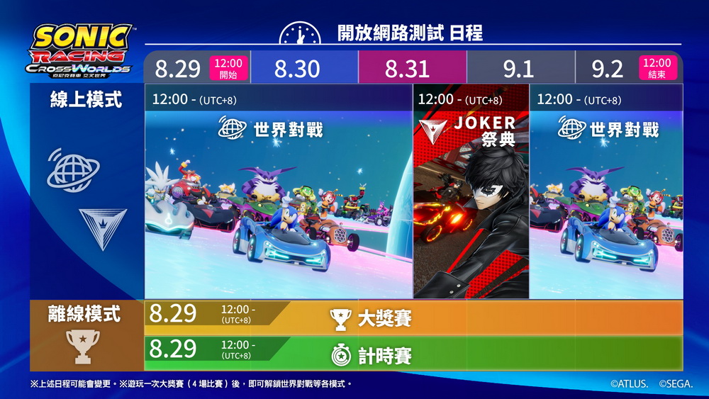 世雅股份有限公司宣布,有關預計於2025年9月25日(四)發售的《索尼克賽車 交叉世界》,現已決定舉辦期間限定的開放網路測試。本測試期間為8月29日(五)12:00(UTC+8)至9月2日(二)12:00(UTC+8),於對應平台(PlayStation®5、Nintendo Switch™、Xbox Series X|S、Steam、Epic Games)開放自由參加。除此之外,預計在8月31日(日)12:00(UTC+8)至9月1日(一)12:00(UTC+8)期間舉辦遊戲內限期活動「女神異聞錄5 皇家版 JOKER祭典」。本次活動中,將可搶先遊玩合作賽車手「JOKER」和合作賽車「Arsene Wing」。