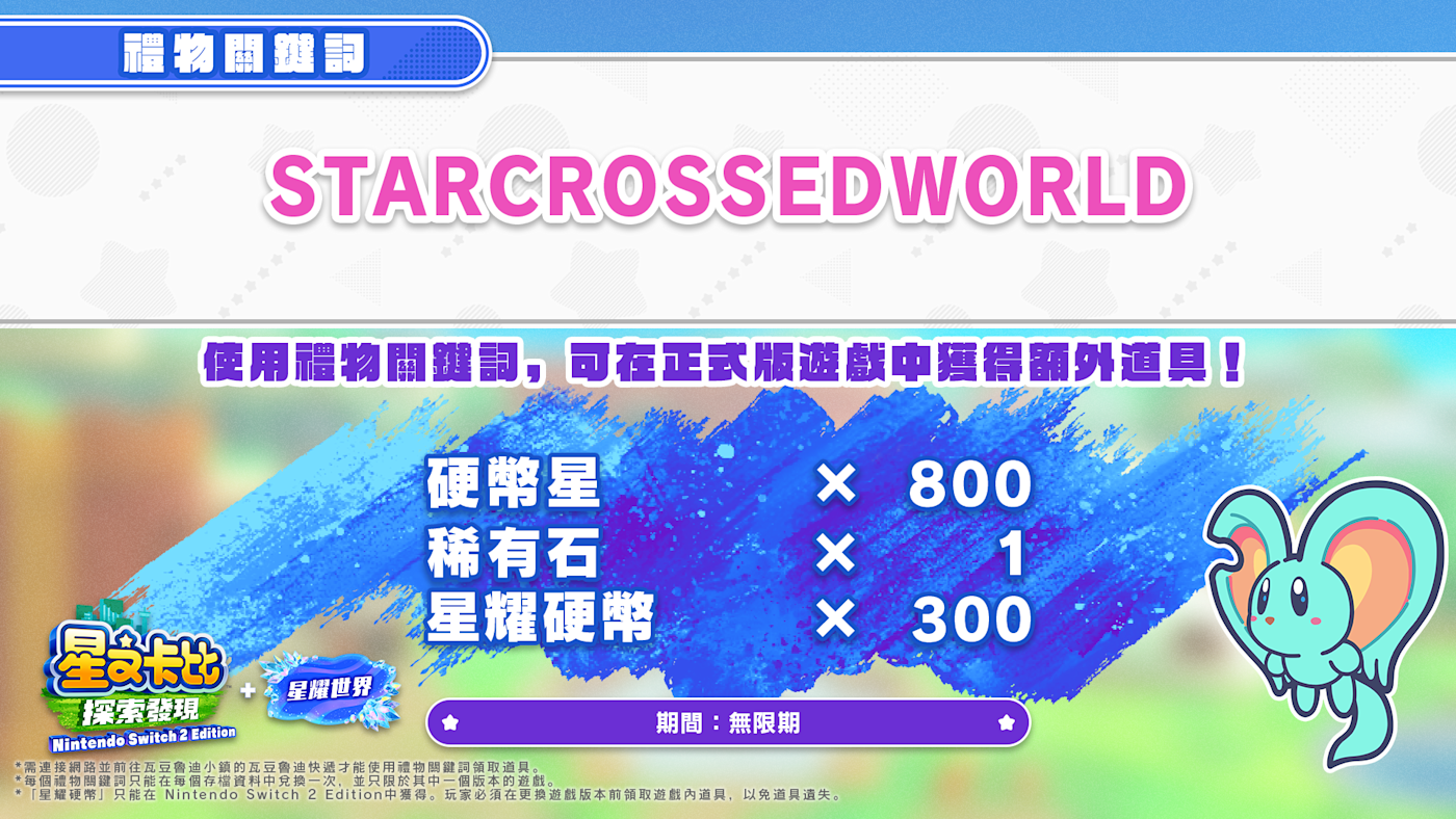 在這次的禮物關鍵詞中,可以獲得在「星耀世界」中新增的星耀硬幣。不論是久違地再次遊玩的玩家,還是冒險新手,都可以嘗試使用一下。