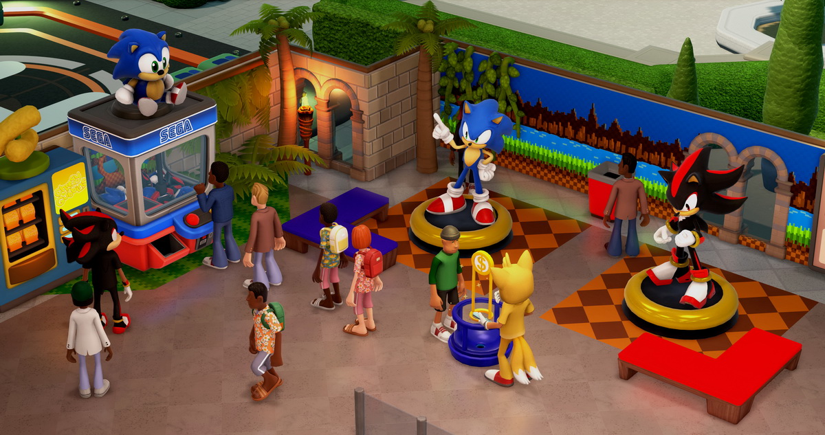 預購特典內含多項索尼克主題內容,包括能夠扮成索尼克與夏特的員工用服裝,以及能夠在遊戲內紀念品店購買的索尼克絨毛娃娃、壁紙、雕像等博物館裝飾。詳細內容請於預購特典介紹影片查看。