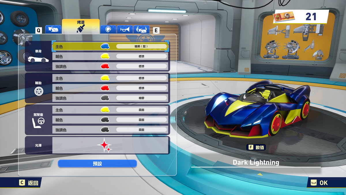 賽車可自訂性能零件、顏色與貼紙,甚至連質感等細節也能自訂,製品版共有70,000種以上的組合能夠精心打造專屬於你的賽車。