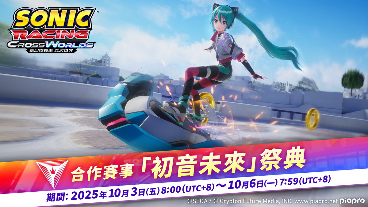 世雅股份有限公司宣布,有關好評發售中的《索尼克賽車 交叉世界》,已於本日2025年10月3日(五)起舉辦合作賽事「初音未來」祭典。於賽事期間收集祭典點數,即可獲得絕無僅有的特別遊戲道具。此外,本作在 Steam 上獲得了「壓倒性好評」的評價,並且在評論匯總網站 Metacritic 的使用者評分也達到 9.0 的高分,受到眾多玩家的支持與喜愛。(Metacritic數據截至10月3日)