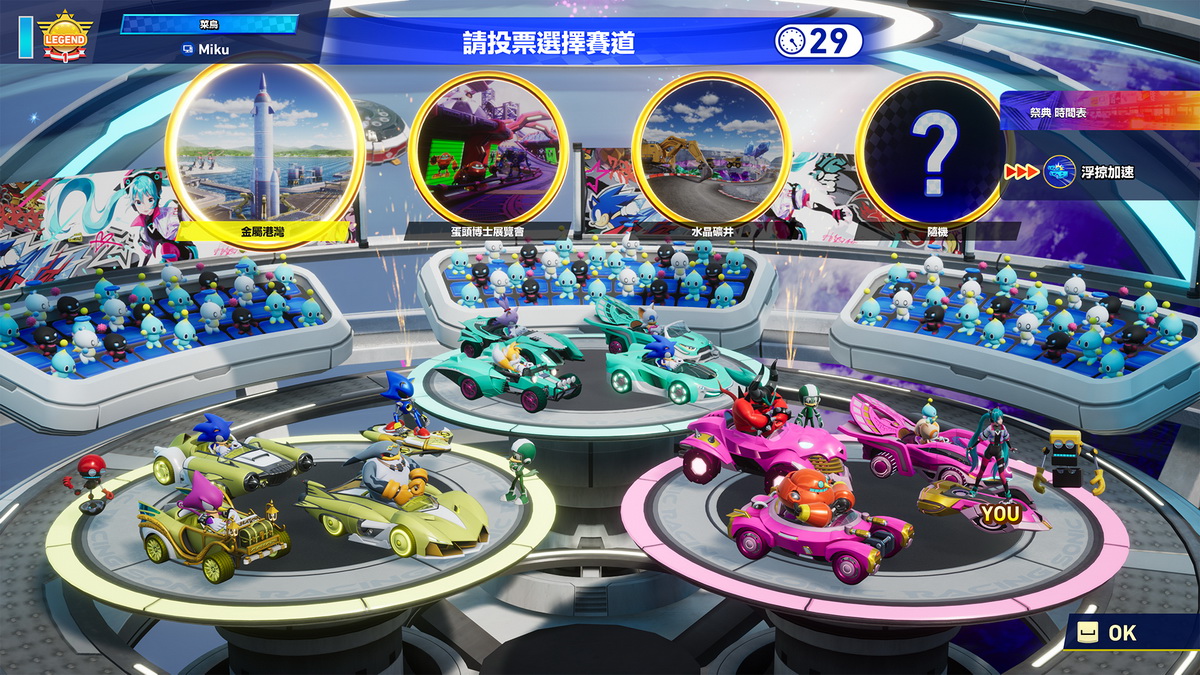 即日起,舉辦紀念「初音未來」合作的特別賽事。於賽事期間收集祭典點數,便可獲得特別的遊戲內道具。此外,透過免費更新可新增賽車手「初音未來」與原創賽車「Diva Macchina」。另外,點唱機亦新增「刺猬索尼克」與「初音未來」透過音樂合作的特別企劃「Project ONSOKU」公開的5首原創歌曲,聆聽合作歌曲並以初音未來與Diva Macchina參加賽事吧。