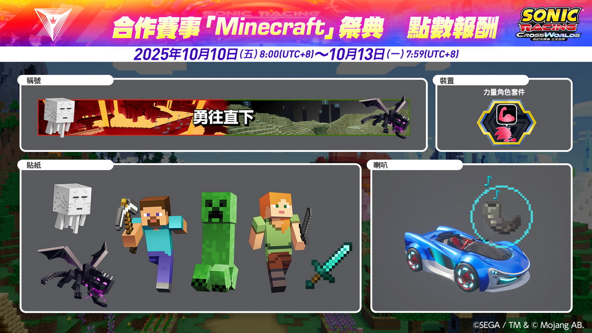 為紀念Minecraft DLC發售,將於《索尼克賽車 交叉世界》遊戲內舉辦特別賽事。於賽事期間收集祭典點數,即可獲得特別報酬。