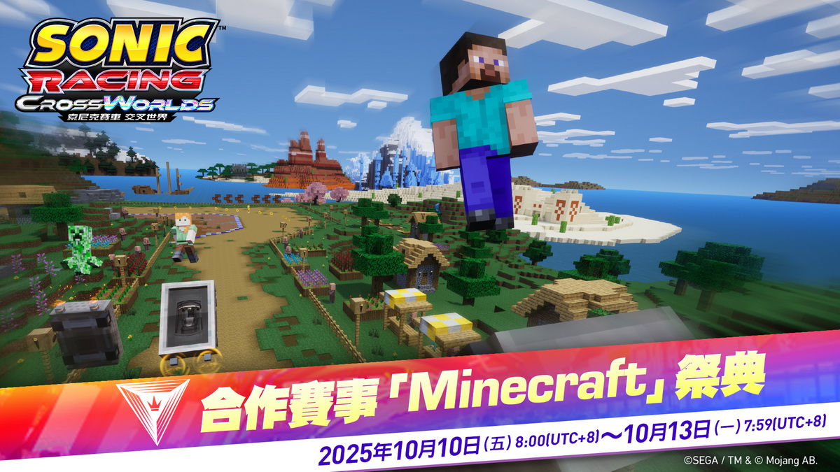 世雅股份有限公司宣布,有關發售中的《索尼克賽車 交叉世界》,已於2025年10月9日(四)起開始發布付費DLC第1彈「Minecraft」。在這個DLC中,不僅可用「史提夫」、「愛莉克斯」及「苦力怕」作為賽車手參戰,還有以「Minecraft」為原型的賽道、賽車以及歌曲。此外,為紀念「Minecraft」DLC發售,10月10日(五)起將於遊戲內舉辦賽事「Minecraft祭典」。盡情享受「Minecraft」的世界吧。