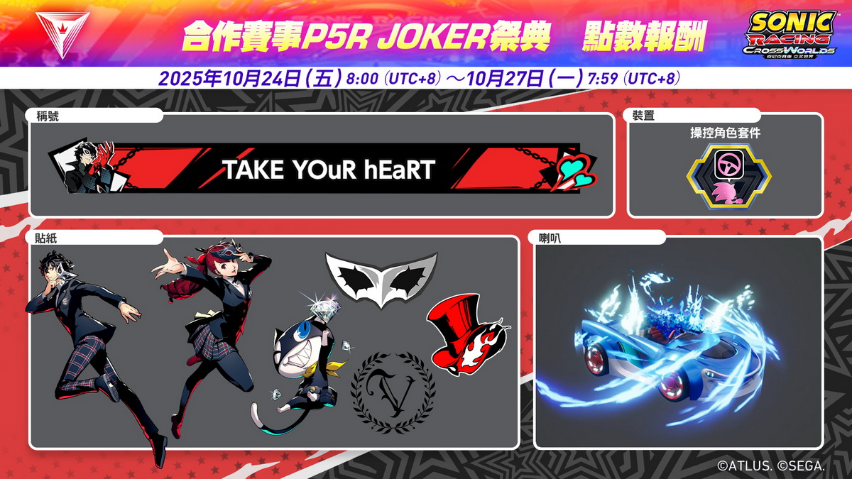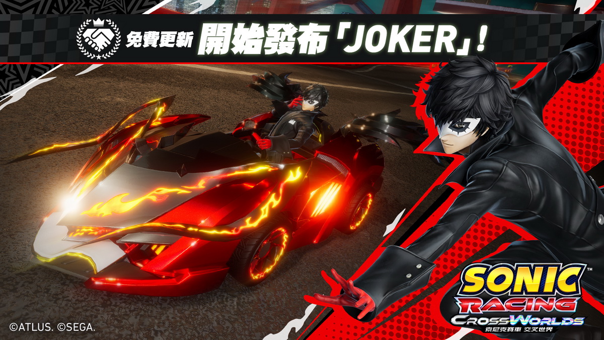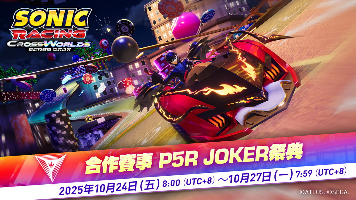 世雅股份有限公司宣布,有關好評發售中的《索尼克賽車 交叉世界》,將於2025年10月23日(四)開始發布免費更新「JOKER(《女神異聞錄5 皇家版》)」。此外,預計於10月24日(五)起舉辦期間限定的合作賽事「P5R JOKER祭典」。於賽事期間收集祭典點數,即可獲得合作賽事獨有的特別遊戲道具。此外,我們也宣布《索尼克賽車 交叉世界》的全球累計銷量已突破100萬套(※1)。